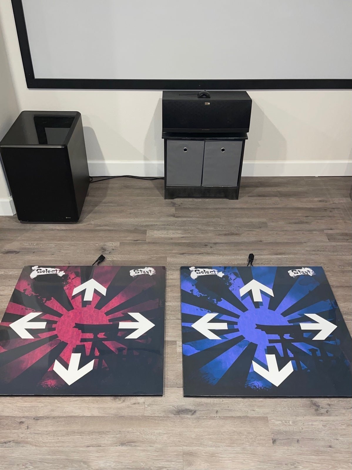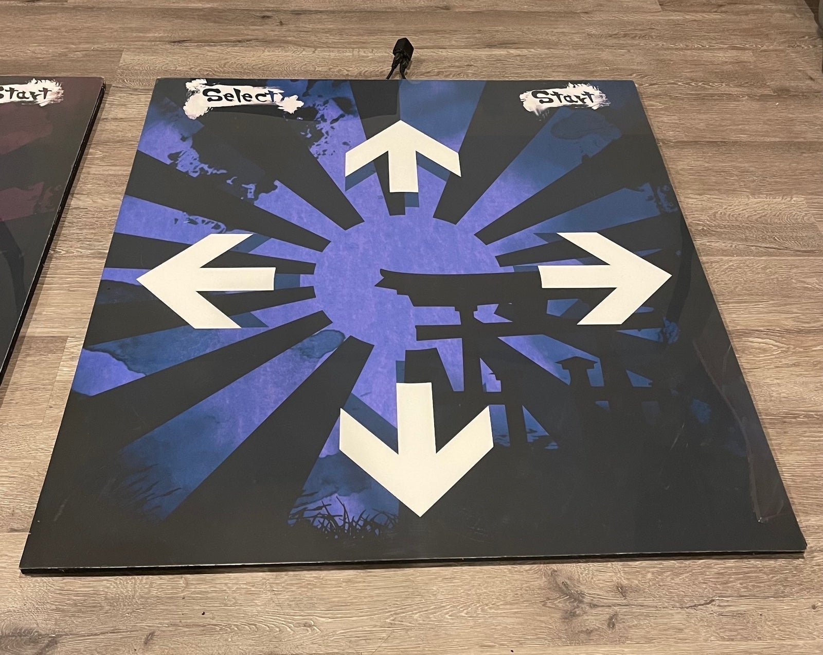 Two high quality very good condition custom built dance pads. These are to be used with computer simulated arcade games such as Dance Dance Revolution, In the Groove or Step Mania. One input and one output ethernet plug on each pad. Dimension of each pad is 1”H x 35”W x 38”L.