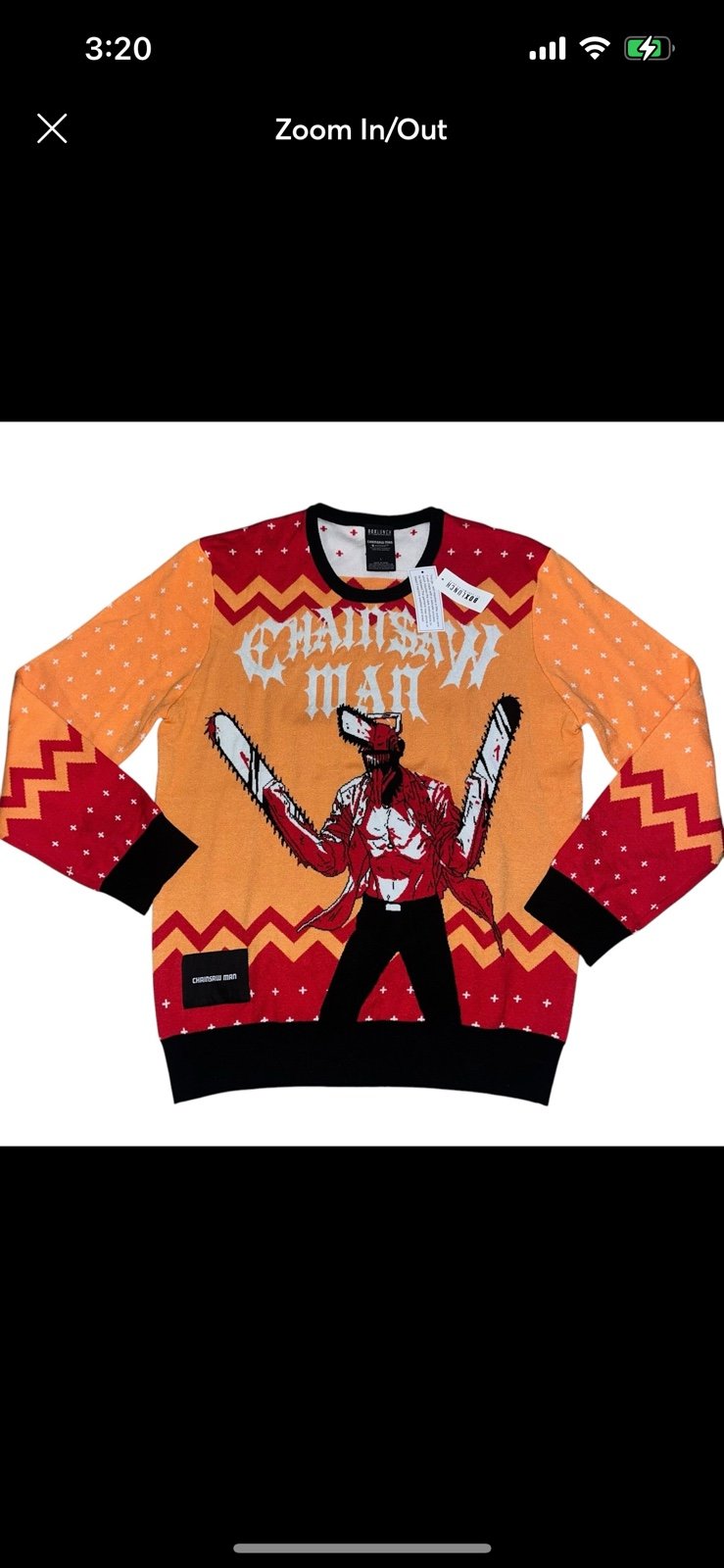 The holidays are a bit bloodier this season! This Chainsaw Man sweater stars a raging Denji below the title lettering, surrounded by zig-zag and dot patterns.