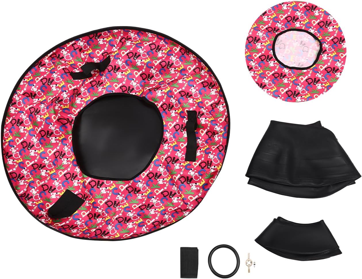 DescriptionHow can winter sports be without skiing? Imagining sliding down a slope and seeing the pure world of white snow. An excellent inflatable sledding tube can bring you the ultimate skiing experience. Our inflatable sledding tube is made of high-quality rubber and Oxford cloth material through the printing process, which is very wear-resistant and durable. Smooth bottom can accelerate skiing speed, allowing you to experience the thrill of speed. Take it with you and enjoy a pleasant skiing time with your child!It is suitable for outdoor skiing, sand sliding, and grass sliding programs. It can be used in playgrounds, snowy mountains, winter mountains and frozen lakes and rivers, training rooms, your backyard, and other places.DetailsCushion: It serves as a good shock absorber for comfortable use.Solid Chassis: The thickened and enlarged chassis increases the force area, which is more stable during skiing and protects children's safety.Pull Loop: It is attached to the pull rope, allowing you to pull your child on flat ground or let them gallop down a gentler slope, which will greatly enhance the bond between child and parent.SpecificationsMaterial: Rubber, Oxford Cloth Color: Black, Red Shape: RoundSport Type: SkiingProcess: PrintingAssembly Required: NoSuitable People: Kids and AdultsLoad-bearing Capacity: 90kg/198.4lbsMinimum Temperature Resistance: -30℃/-22°FGross Weight: 10.8kg/23.81lbsProduct Diameter: 90cm/35.43inPackage Size: 80*80*10cm/31.49*31.49*3.94inPackage Included1*Inflatable Sledding Tube 1*CushionOther AccessoriesNotes1. Please use this product within the load-bearing range. The tow rope is for hand pulling only, do not tow with a vehicle! 2. Please purchase professional helmets, and knee and elbow protectors, and take proper exercise safety measures before use.3. Please do not over-inflate or fill with high-pressure gas. Please do not jump on the inflatable product. 4. Please fold the inflatable product and place it in a flat place away from light when it is not used for a long time. Please do not place the inflatable product next to flames or hot objects. 5. Please avoid excessive friction and touching by sharp objects. 6. Please note that the natural air leakage of the inflatable product is normal.7. Please allow the slight color difference caused by the shooting light and 1-3cm error due to manual measurement, and make sure you do not mind before you order.
