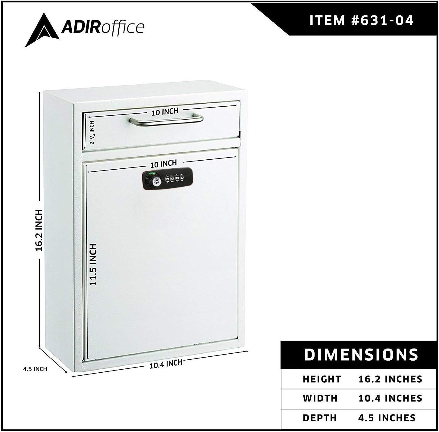 Why Choose the AdirOffice Ultimate Drop Box Wall-Mounted Mailbox? FEATURESBuilt to Last. Constructed from durable, heavy-duty 16-gauge galvanized steel, the AdirOffice Ultimate Drop Box Wall-Mounted Mailbox is made to provide long-lasting strength well into the future. Items are deposited through the bin door and then are stored in the box’s generous storage capacity. These contents can then be retrieved through the locking access door.Keep Items Secure Inside. Ideal for retail stores, military bases, rental facilities, service counters, manufacturing plants, auto dealers and other facilities, this secure drop box features an anti-fishing bin door that accepts letters, checks, keys and other small bundles.Perfect Storage Solution. This powder-coated, scratch-resistant finish mailbox is the most convenient solution for after-hour drop box applications like night drops, key drops, payment drops, interoffice mail and the like. Plus, it has a state-of-the-art bin door that is wide enough to accommodate bigger objects than the average mailbox, such as letters, small parcels, checks, bills, payments and other similar items.