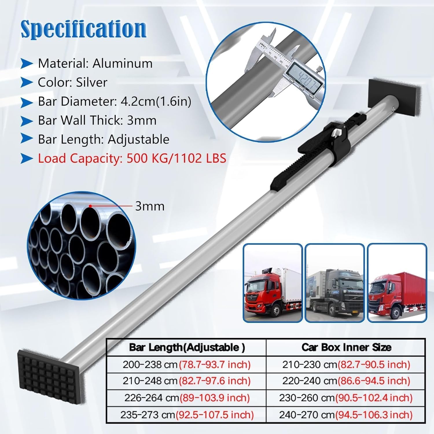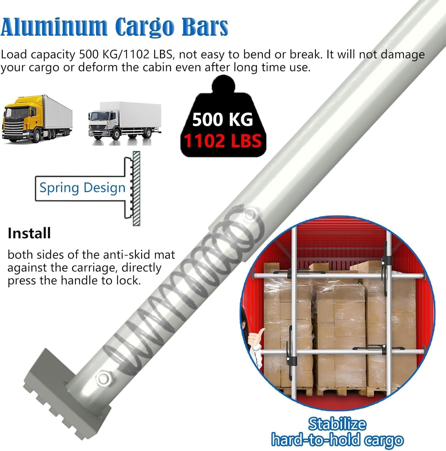 - If you are using an enclosed trailer or truck to transport goods, you'll need to ensure your freight load stays in one place and remains undamaged. - Look no further than our adjustable cargo bar!!! Secure and Versatile Transportation Solution.- It's great for family sedans, SUVs, minitrucks, pickups, etc. Keep your cargo from shifting.- Specification1. Material: Aluminum2. Color: Silver3. Bar Diameter: 4.2 cm(1 3/5 in)4. Bar Wall Thick: 3 mm5. Bar Length: Adjustable 6. Load Capacity: 500 KG/1102 LBS7. Assembly: No- Features:1. The safety clip ensures a firm lock, preventing any accidental loosening. 2. Prevent hazardous distractions and securely haul everything from heavy equipment to recreational gear and groceries3. This slight load lock bar can be easily stored when not in use.4. It will lock your load in its place so you can avoid freight movement inside your trailer. 5. As load dividers when one trailer carries freight that will be delivered at various points. 6. This is a stabile bar that keeps stuff from sliding towards the cab of the truck. 7. Spring design provides shock absorption- Package Content1 x Cargo Stabilizer Bar- Notes:1. So please put away from little kids to avoid from poking risks.2. There may be an error of 1-3 cm due to manual measurement.