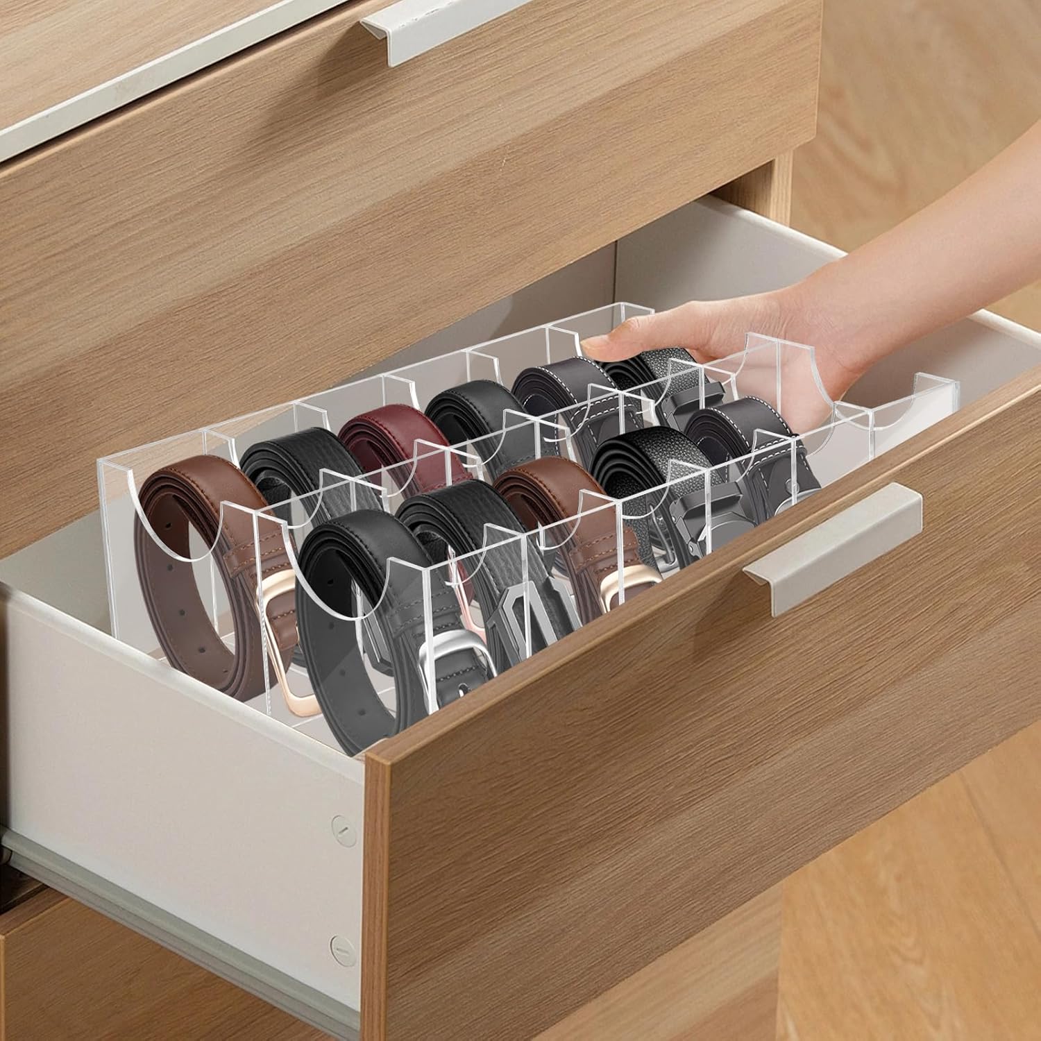 Still worrying about not finding the right belt organizer? This belt organizer with dust cover will fit your belt perfectly, simple and elegant, very advanced. Acrylic high-definition transparent material can show your belt, and middle arc design is convenient to take out the belt you want. Product Features and Benefits 1. The acrylic material is high-definition and strong, advanced and durable. 2. The 12-compartment belt box can hold most of your belts. 3. Can store belts with large buckles. All you need to do is hang the buckle on the side. 4. The middle arc design allows you to easily pick up the belt. 5. Acrylic display stand can display your belts, ties and bow ties and other products. Product Specifications: Material: High-quality Acrylic Material Color: Clear Product Size: 13.4*9*4.4 inches