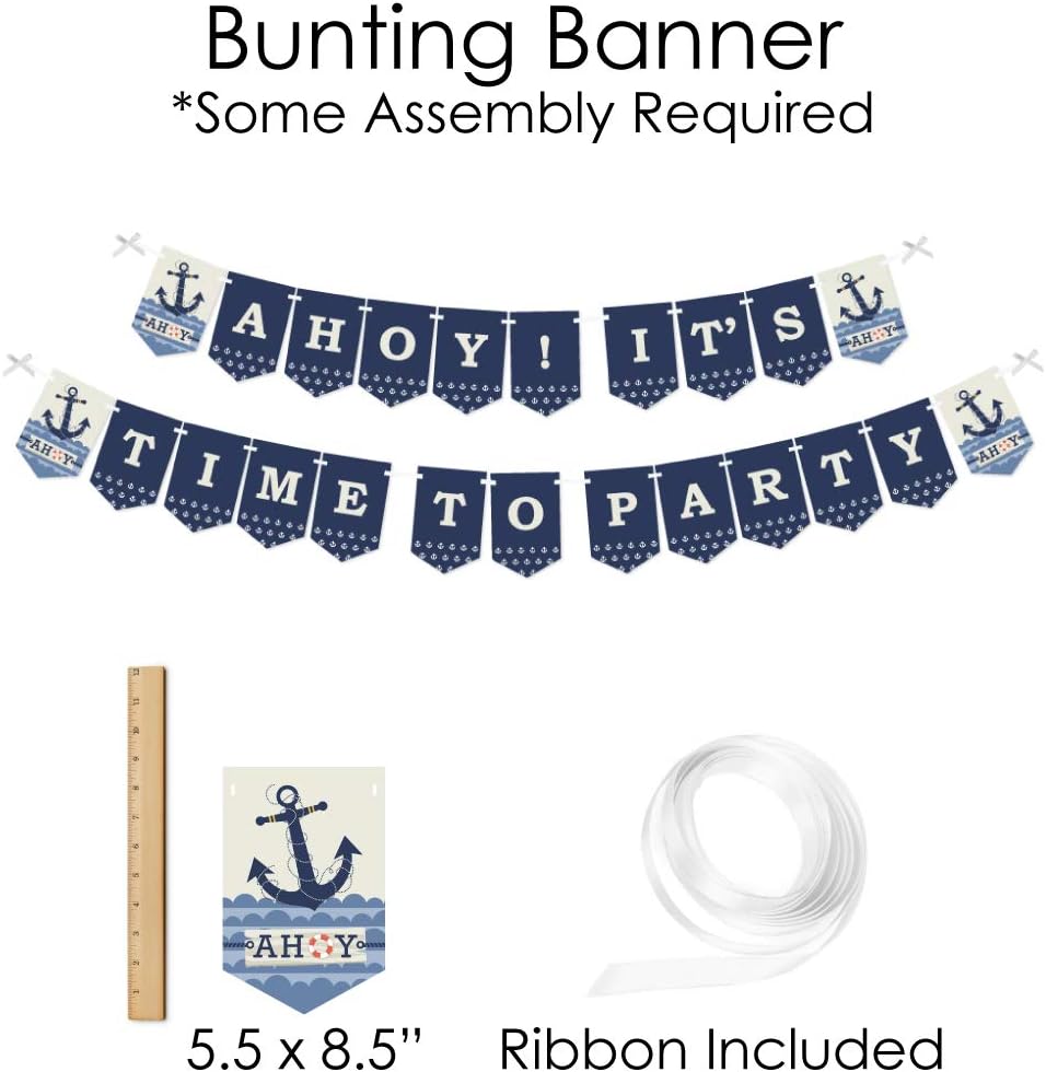 All you need for a Ahoy - Nautical baby shower or birthday party in one party kit. Doterrific Party Bundle includes a bunting banner, paper chains, and a 10-piece photo prop kit. Welcome party guests with the bunting banner and style a nautical photo booth with paper chains and funny photo props. Please Note: Assembly Required.
