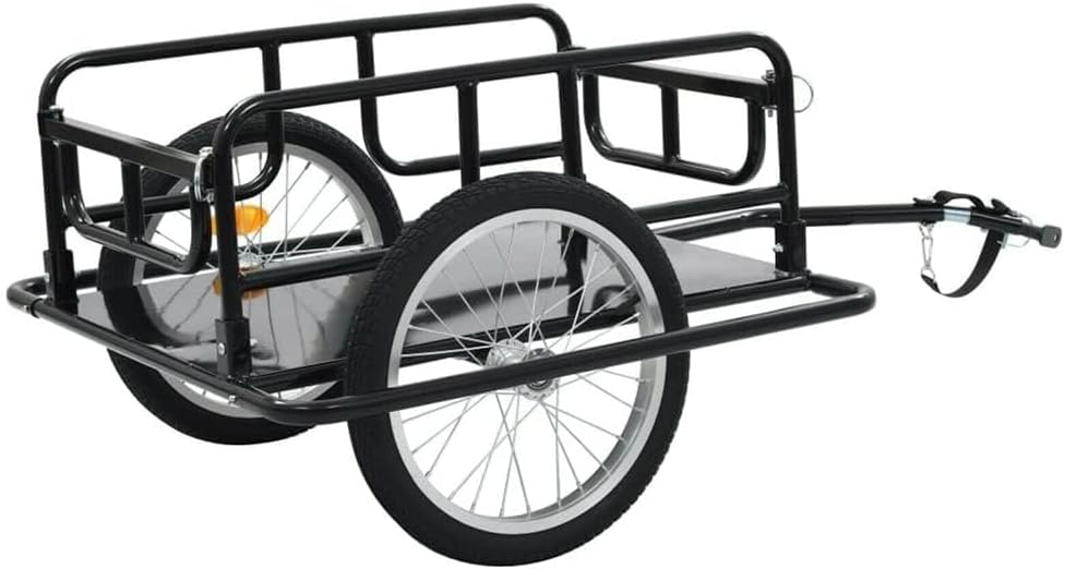 Folding Bike Cargo Trailer Solid Steel Frame Bicycle Cart with 2 Wheels for Carrying Heavy Goods, Foldable Bike Cargo Trailer Bicycle Cart Wagon Trailer with Hitch 110lbs Bicycle TrailerSpecifications:Color: BlackMain material: SteelOverall dimensions with drawbar: 51" x 28.7" x 20" (L x W x H)Overall dimensions without drawbar: 26.5" x 28.7" x 20" (L x W x H)Cargo compartment dimensions: 26.5" x 17.5" x 11" (W x D x H)Maximum load capacity: 110 lbsFeatures:Foldable DrawbarHinged front and rear gates15.4" wheels with yellow reflectorsFolds flat easily for storage and transportPlease note that it is not suitable for transporting children!