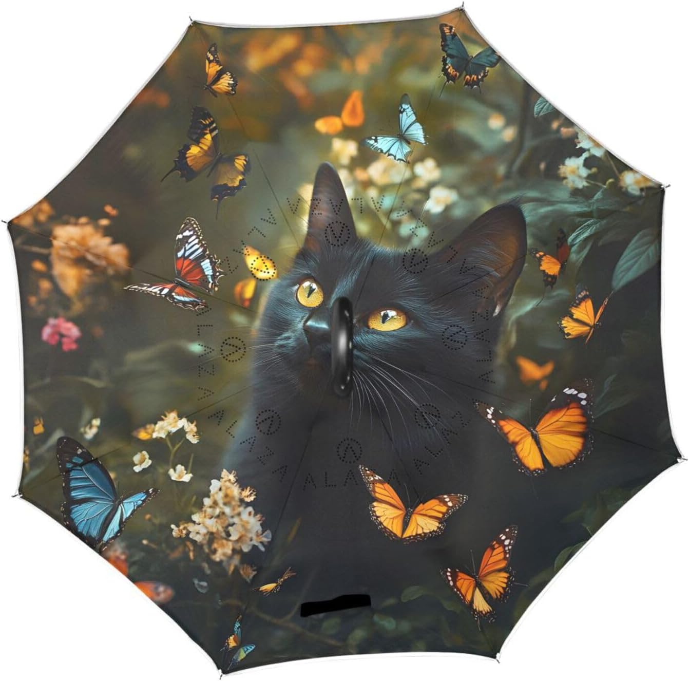 Black Cat Butterfly Inverted Umbrellas for Rain Windproof Reverse Upside Down Golf Umbrella with C-shape Handle for Men Women