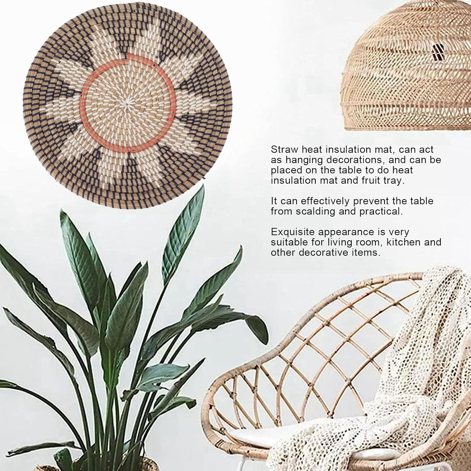 Description:Hand Woven: This insulation pad is hand woven with fine workmanship and details, providing a good decorative effect, great for decorating your living room or other interior spacesMultiple Uses: The baskets for wall decor can be used anywhere you can think of, either as a wall background decoration or as a rustic fruit tray, and also as an art collection, with strong practicality and decorative qualitiesHeat Insulation Protection: This hanging wall basket is made of effective insulation material, which can protect the table from burns and can hold several bowls of soup and hot drinks, so you can enjoy a warm and comfortable meal timeBedroom Wall Decoration: This boho kitchen decor is a great product for bedroom wall decoration, which not only provides a comfortable and pleasant visual effect, but also fills the bedroom with warm and romantic feelingGreat Gift: This rattan wall decor is a good gift, woven wall decor can fully express your heart and emotion, it has practical value as well as decorative and artistic, it is a great choice for gift givingItem Type: Round Wall OrnamentsMaterial: GrassWeight: Approx. 478g / 16.9ozDiameter: 35cm / 13.8inPackage List:1 x Round Wall Ornament