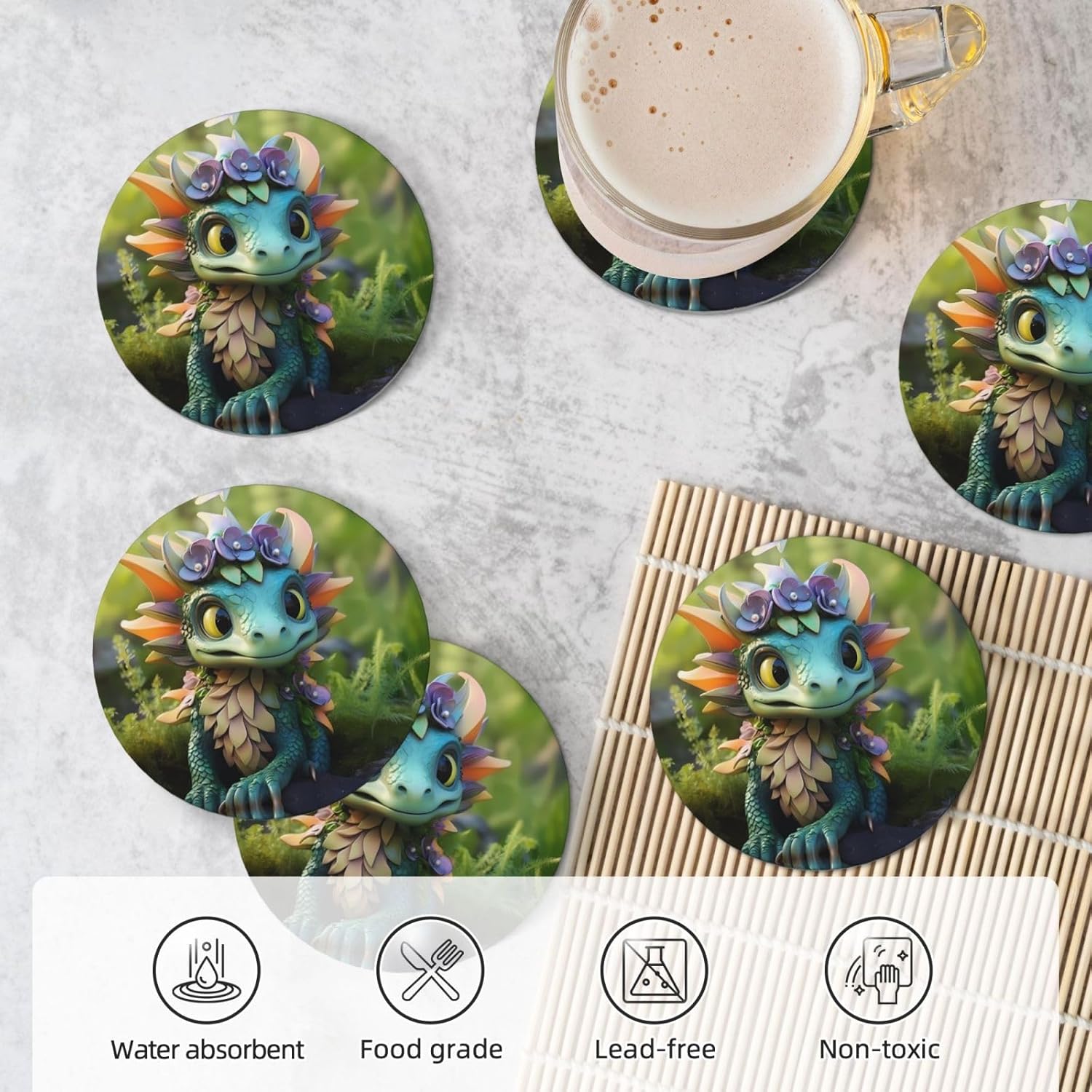 Our Cute cute dragon printed ceramic coasters are meticulously crafted from ceramic. Not only do they look elegant, they're also incredibly practical, effectively keeping your table dry and preventing damage to furniture. Compared to common coasters made entirely of cork, leather, paper, or rubber, ceramic makes your life more convenient. The soft cork base of the coasters won't scratch tables and other surfaces, while also providing excellent anti-slip properties to prevent cups from sliding and bumping. This thoughtful design demonstrates our commitment to product quality. Furthermore, these coasters come with a black metal stand, making them easy to store and aesthetically pleasing, adding a touch of elegance to your tabletop. Whether in the kitchen, living room, bar, hotel, or restaurant, these coasters will create a striking and elegant addition to your living space. Furthermore, these coasters make for a beautiful gift. For special occasions like birthdays, Mother's or Father's Day, Valentine's Day, wedding anniversaries, housewarmings, or Christmas, give these coasters a practical and meaningful gift that will truly convey your thoughtfulness and care. This set includes six cork-bottomed ceramic coasters and a black metal stand. They come in a variety of shapes and sizes. The round coasters have a diameter of 10.3 cm, the square coasters have sides of 10 cm, and the hexagonal coasters have sides of 11 cm and 9.5 cm, respectively, to meet your diverse needs. Choosing our printed ceramic coasters will make your life more comfortable and elegant.