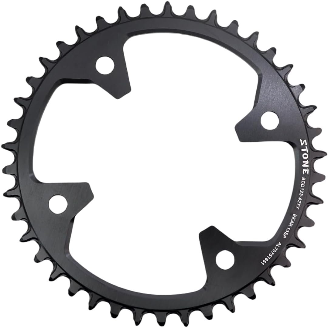 DJC Stone 123BCD Round Bike Chainring for Campagnolo Ekar Crank Gravel Road Bike 1x13 Crankset for CP 13 Speed C13 ChainFeatrures:Fit : 123BCD for campagnolo Ekar crank, only for Ekar 13 speed chain.Narrow wide tooth, it design for 1x speed only, can not use as 2x speed, not support front shifting derailleur. Chain Speed support: only for Campagnolo Ekar C13 chain, 13 speed.Tooth: 38T-50T; Size: 123 BCD round; Thickness: 4MM.Material: High strength Aluminum 7075-T651; high precision CNC processing; offer best stiffness and endurance. Package Contents:1pcs chainring.Advantages:1, This kind of chainring made from high strength Aluminum 7075-T651, offering best stiffness and endurance.2, High precision CNC processing. Working accuracy 0.03mm. Ensuring that offers you the best riding component.Package Contents:1 x chainringTooth--Max diameter(mm)--Weight(g)38 T , 162 mm , 65 g40 T , 170 mm , 70 g42 T , 178 mm , 78 g44 T , 186 mm , 87 g46 T , 194 mm , 98 g48 T , 202 mm , 109 g50 T , 210 mm , 116 g