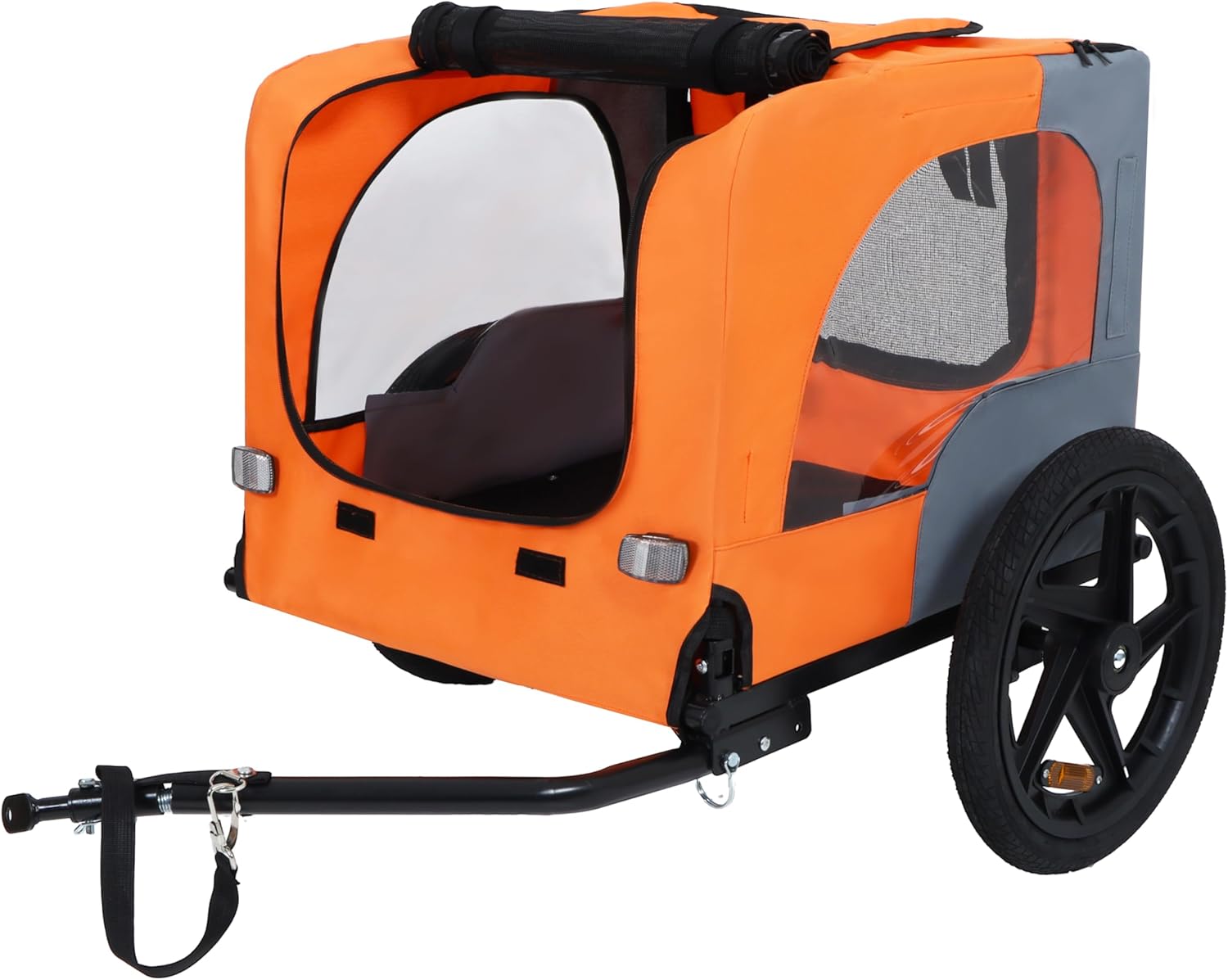 Adventure Together, Everywhere! Your Dog's Ultimate Bike Trailer Awaits.Tired of leaving your furry best friend behind? Our premium dog bike trailer is your ticket to unforgettable shared adventures! Crafted for durability and peace of mind, it transforms your daily bike rides into joyful family excursions. Imagine the wind in your hair and the happy panting of your Beagle or Border Collie riding securely beside you—this can be your new reality.Engineered for Lasting Performance & Easy TravelConstructed with a rugged, powder-coated steel frame and tear-resistant Oxford fabric, this trailer is built to handle the rigors of the trail. The ingenious foldable design allows it to collapse in seconds, making storage in your car trunk or garage a breeze. Coupled with low-maintenance, air-filled nylon wheels that ensure a smooth glide over various surfaces, taking your adventure companion along has never been simpler.All-Weather Protection Meets Superior ComfortDon't let a change in weather cancel your plans! The weatherproof canopy with a zip-down mesh shield offers versatile protection from both sun and rain. Multiple breathable mesh windows and a spacious roof vent create excellent cross-ventilation, allowing your pet to enjoy the sights and sounds without feeling stuffy. It’s the perfect mobile crate for a comfortable cruise.Uncompromising Safety for Complete Peace of MindYour pet's safety is our top priority. An adjustable inner safety leash clips to your dog's harness, preventing unexpected jumps, while the non-slip floor provides steady footing. For low-light conditions, integrated reflective strips and a tall safety flag dramatically increase visibility to cyclists and vehicles, ensuring you're seen and safe.Your Go-Anywhere Pet SolutionMore than just a bike trailer, it's your partner for every outing. Perfect for weekend trail explorations, trips to the local farmer's market, or a relaxing ride to the park. Quick-folding and incredibly portable, it empowers you to include your pet in every aspect of your active life. Stop dreaming of adventures and start having them—add to cart now and create lasting memories with your four-legged family member!