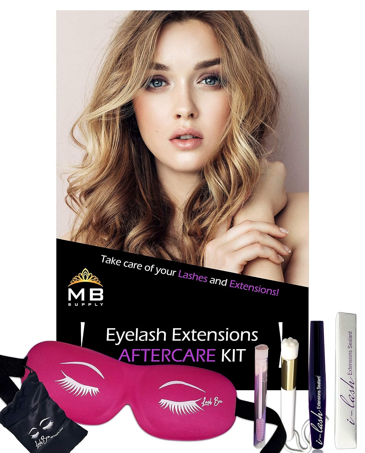 Introducing... MBsupply's Eyelash Extensions Mini Aftercare Kit With Lash Bra 3D Protective Eye Sleep Mask We love our Eyelashes and Extensions and pay good money, so we take care of them the best we can. The MBSupply Mini Aftercare Kit is designed to do just that! Use our aftercare kit to cleanse, nourish and protect your lashes and extensions. The included products in the MB Eyelash Extensions Aftercare Kit integrate with any eyelash extensions brand out there safely and will not harm lashes or adhesive. What's in the Kit? 1-Cleanser brush 1-Decorative Diamond Spoolie in tube for sanitation 1-Coating Sealant Extends the life of the eyelash extensions glue & helps maintain extensions 1-Black or Pink Lash Bra with storage pouch: Sleep Protector Eyelash Mask-3D contoured shape gives eyelashes and extensions space for freedom of movement while you sleep. Keeps them looking and feeling great! BLACK Lash Bra
