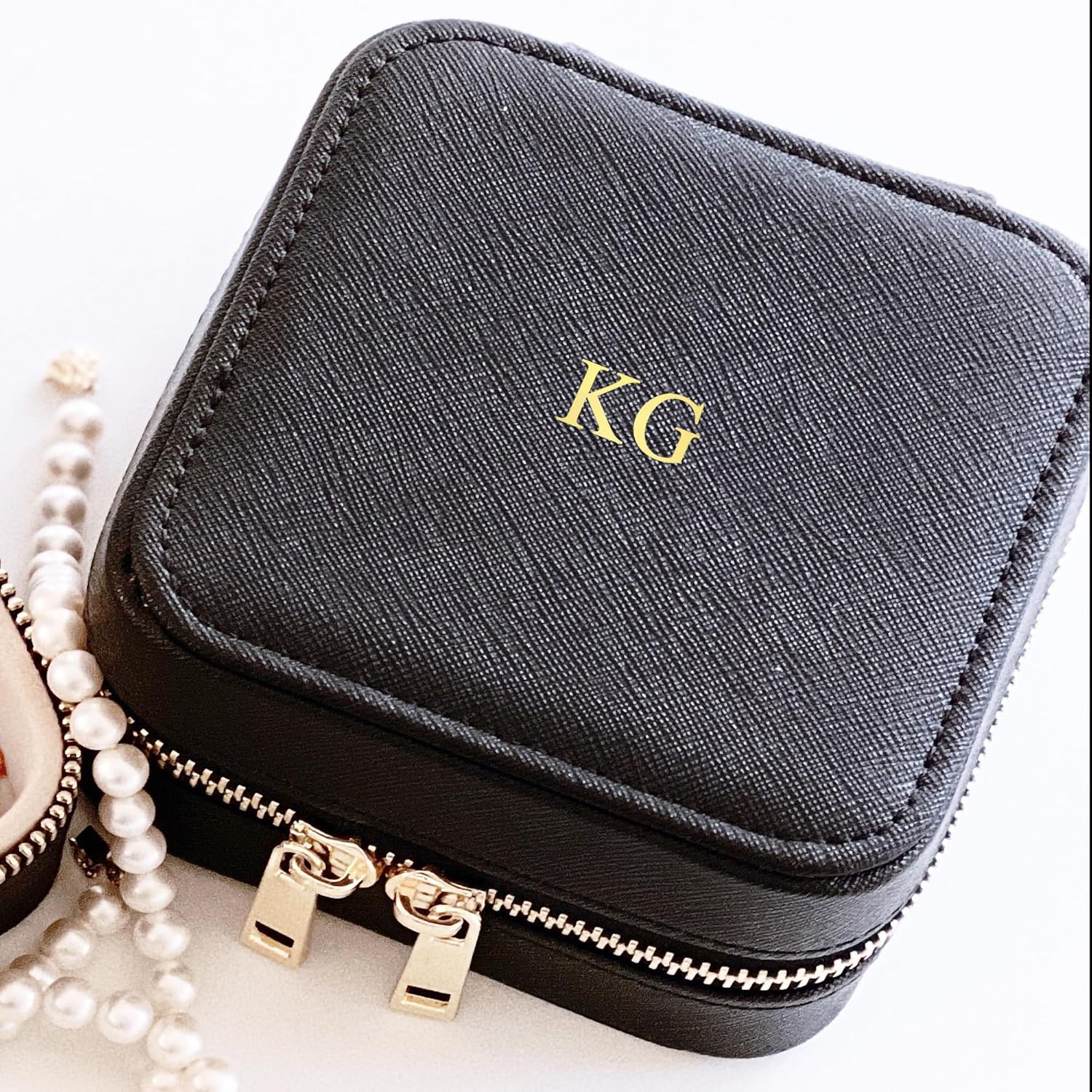 Elevate your jewelry storage with this exquisite personalized Saffiano leather jewelry case. Measuring 4.5 x 4.5 x 2.5 inches, this medium square case combines luxury and functionality in a compact design. The premium leather exterior features elegant gold monogram personalization, making each piece uniquely yours. The case opens with a smooth zipper closure to reveal a thoughtfully organized interior with dedicated compartments for rings, earrings, and other precious pieces. A built-in mirror adds convenience for on-the-go accessorizing. Available in sophisticated colors including black, brown, burgundy, and blush pink, this versatile case serves perfectly as a travel companion or everyday jewelry organizer. The durable Saffiano leather construction ensures your treasured pieces remain protected and beautifully displayed. Perfect for gifting on special occasions or treating yourself to organized luxury.