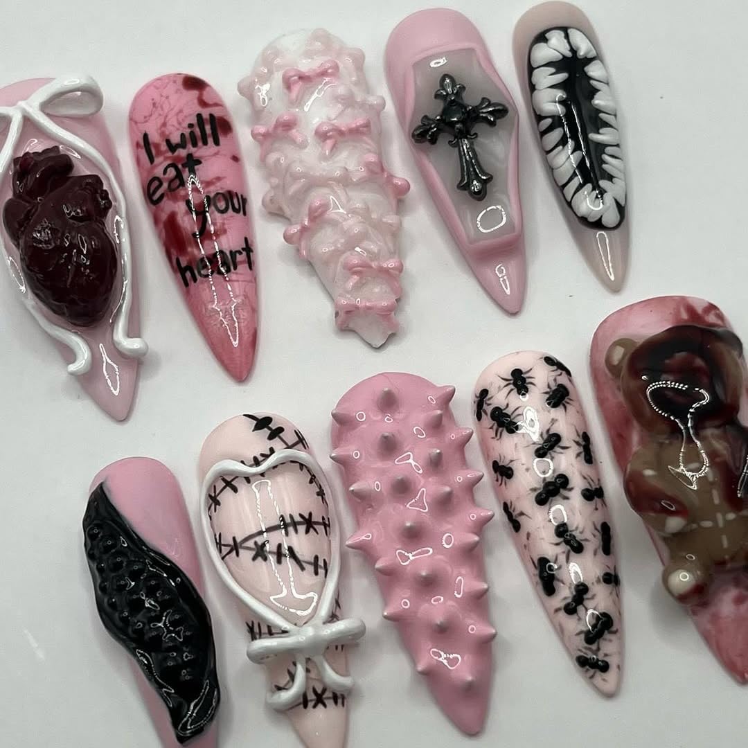 Dare to stand out with this handmade Gothic Horror press on nail set designed for lovers of creepy cute and dark aesthetic fashion. Each nail is a unique statement piece featuring unsettling yet artistic 3D details such as a realistic sculpted heart, stitched corset motifs, bloody teddy bear, black gothic cross charm, and eerie teeth designs. The set also includes spiked textures, crawling ant patterns, bold lettering “I will eat your heart,” and striking black-and-white contrasts over a pastel pink base. This unexpected mix of horror and sweetness creates a truly one-of-a-kind look. Made from high-quality materials, these nails are lightweight, durable, and reusable, giving you professional salon results at home. Easy to apply and remove, they are perfect for Halloween, horror photoshoots, gothic cosplay, themed parties, or everyday wear if you love making a bold fashion statement.