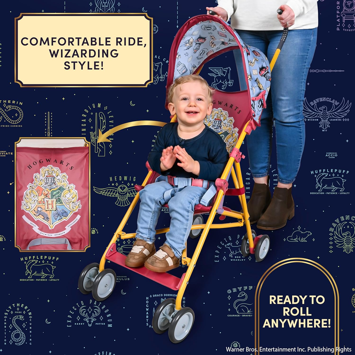Bring a touch of wizarding wonder to every outing with the Harry Potter Umbrella Stroller! Featuring the iconic Hogwarts crest with all four houses, this stroller makes everyday adventures feel magical. Designed for comfort and safety, it includes a secure 3-point harness, supportive seat, and footrest so your little one can enjoy the ride. The adjustable canopy helps protect from sun or light rain, while locking rear wheels keep the stroller steady and reliable. Lightweight, foldable, and compact, it’s perfect for travel, errands, or simply strolling through your own enchanted world. With the Harry Potter Umbrella Stroller, every trip feels like a spellbinding adventure - safe, comfortable, and full of magic.