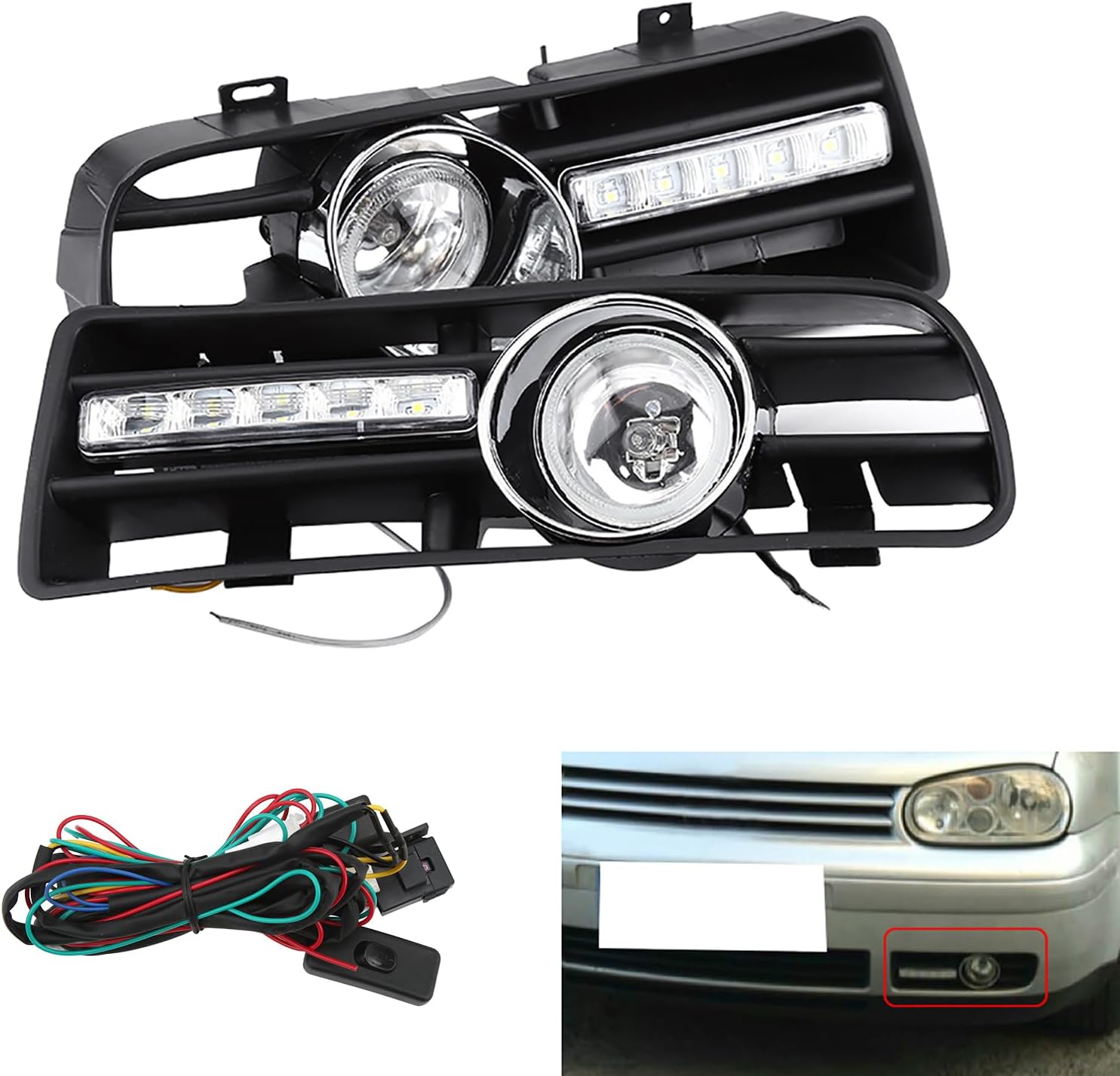 Features:1. LED daytime running light and fog light with front lower side grille, a direct replacement for the old one.2. 10 LEDs and a H3 55W 12V bulb on each side.3. Easy to install.4. Comes as a PAIR.5. and dustproof.Specifications:Fitment: for 1997-2006 for / TDI MK4Material: ABSGrille color: BlackFog light bulb color: AmberLED color: 5 amber LED turn light + 5 white LED daytime running lightColor temperature: 6000KBulb: H3 55WLED number: 10 LEDs/PcsLED Power: 5.5W/PcsWorking voltage: DC 12VQuality: 1 Pair (left & right)Item size: approx. 29 * 10 * 3.5cm / 11.4 * 3.9 * 1.4inItem weight: approx. 367g / 12.9ozPackage size: approx. 31 * 15 * 12.5cm / 12.2 * 5.9* 4.9inPackage weight: approx. 1019g / 35.9ozPackage List:2 * Fog Light and Daytime Running Light with Grille1 * Digital Controller with Wire