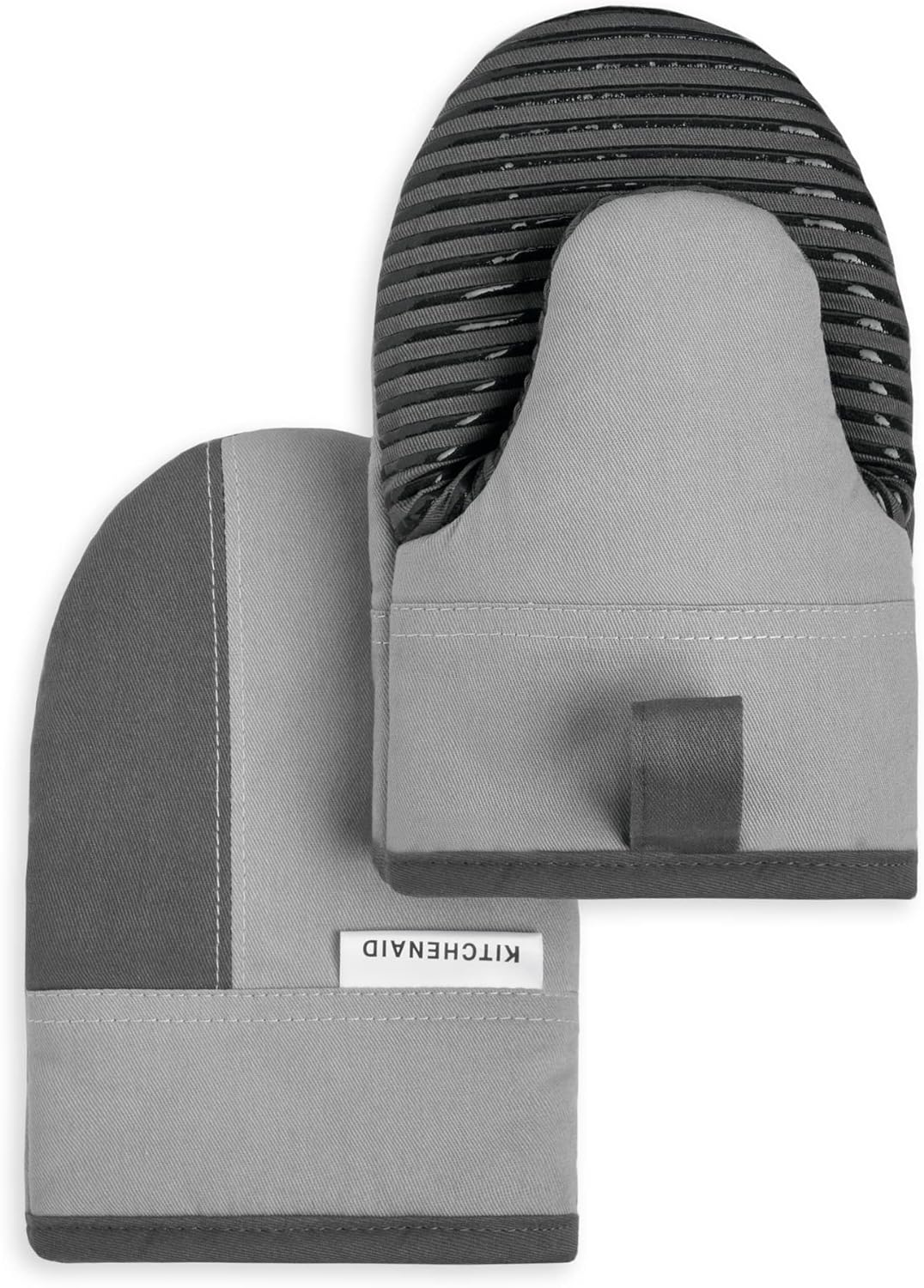 KitchenAid Beacon Two-Tone Non-Slip Mini Oven Mitt Set, Cool Grey/Frost Grey, 5.5"x8", 2 PieceShield your hands from the heat and burns with the KitchenAid Beacon 2-Piece Mini Oven Mitt Set. Made of heavy-duty cotton with polyester lining that offers comfort and insulation. This set includes two mini oven mitts that each measure 5.5 inches wide by 8 inches long for easy on and off use. These mitts are heat resistant with clear printed silicone to ensure a more firm and secure grip. Featuring a convenient hanging loop for display or easy storage.KitchenAid Albany Kitchen Towel 4-Pack Set, Charcoal Grey/White, 16"x26"Get your kitchen chores done in classic style with the Kitchen Aid Albany Stripe Kitchen Towel 4 Piece Set. The set includes two solid kitchen towels and two striped towels that measure 16 inches wide by 26 inches long. The solid towel is made with highly-absorbent cotton and works well for wiping splatters and spills, cleaning countertops, and drying dishes since it is non-abrasive and safe for use on most kitchen surfaces. The striped kitchen towel is made with a cotton-polyester blend for durability and versatility use while tidying up. These soft kitchen towels are perfect for everyday use including daily household chores. Perfect for drying and cleaning glassware, cookware, flatware and more. While not being used, these multi-purpose kitchen towels can be used as placemats or displayed in your kitchen on hooks or on your appliances as decorative kitchen accessories. Place these kitchen towels in your kitchen, bathroom, laundry room or work area. New kitchen towel sets make the perfect gift for a housewarming or hostess gift. Easy clean machine washable. Made in India.