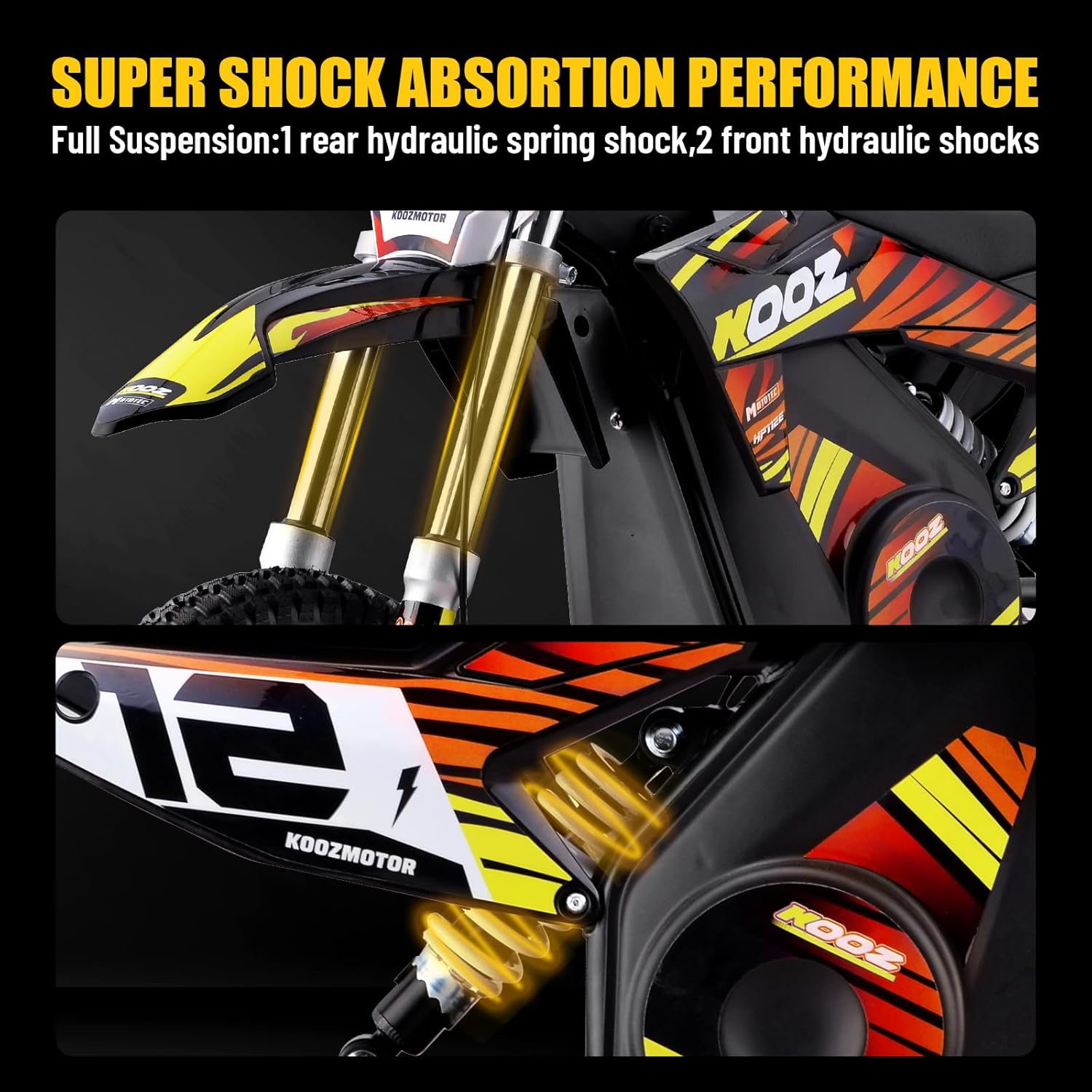 Introducing the 36v 1000w Electric Dirt Bike! Powered by a 1000 watt DC brushed electric motor, rugged chain drive, front and rear suspension and half twist throttle for safety. Great for driveway and backyard fun, cruise over bumps and speed through dirt trails with ease. Motor: 36v 1000w Battery: 36v/7.8ah Lithium Battery Top Speed: 6-18 mph (adjustable with variable knob) Charge Time: 5-6 hours (when fully drained) Suspension: 2 front hydraulic shocks, 1 rear hydraulic spring shock Ride Time: 45 minutes Certification: UL 2489 Throttle: Half Twist Recommended Age: 13+ Years Frame: Steel Transmission: Chain Drive Front Wheel: 2.4x16 Rear Wheel: 2.50-10 Brakes: Front & Rear Disk Max Rider Weight: 150 lbs Seat Height: 24.5 inches Wheelbase: 37 inches Min Ground Clearance: 10 inches Box Weight: 51 lbs Box Size: 42x22x15 inches Dirt Bike Weight: 51 lbs Dirt Bike Size: 52x25x34 inches