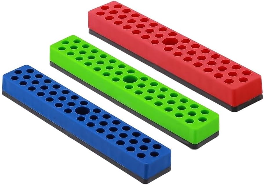 Feature:Magnetic Base: The magnetic base is strong enough to hold the bits without them falling out in a tool box . It is strong enough to hold bits even when it's upside down but easy to remove from it.Excellent Quality: Made of , heavy duty, and for impact resistant polypropylene material, it can be used for a long time.Make Accessibility Easy: Open design is help for easy access and removal of various bits. No more trying to access bits from a salt shaker or from a plastic storage box that doesn't even secure bits when it is new!43 Holes Bit Storage: The magnetic hex bit holder can hold up to 43 of your 1/4 inch hex bits. Lots of space to hold a variety of drivers and bits.Keeps Bits Organized: Quick and easy way to organize cluttered toolboxes and work areas with this holder for Bits.Specifications:*Product Name:Magnetic Hex Bit HolderSuitable for 1/4inch screwdriver bit*Material:plastic*Size:180x20x31mm*Color:red green bluePackage Content:1 x Bit Holder