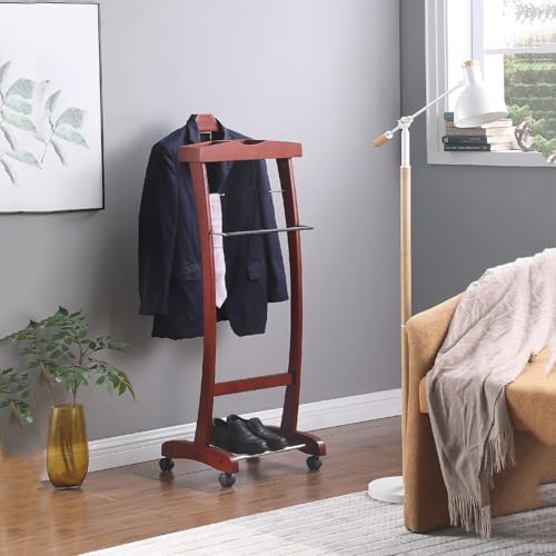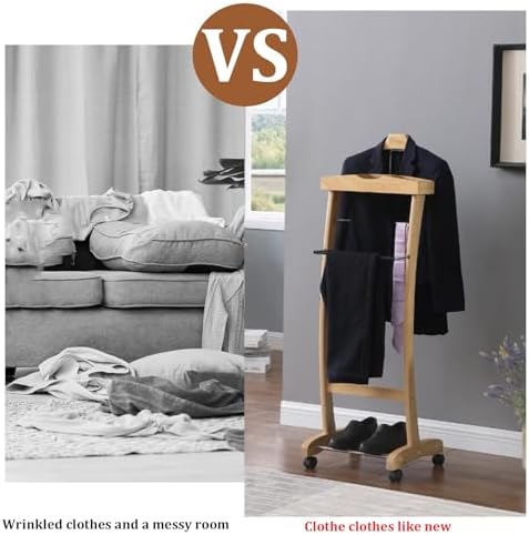 Introducing our versatile wheeled portable solid wood suit rack, expertly designed to meet your hanging and storage needs while adding a touch of elegance to any space. Available in two stylish colors, this rack features a sturdy solid wood frame that ensures durability and longevity. With contoured hangers, a non-slip trouser hanger, and a dedicated tie bar, your garments will be organized and maintained in pristine condition. The thoughtfully designed top tray provides convenient storage for small items such as accessories, while the spacious bottom section is perfect for shoes, keeping your wardrobe tidy. Thanks to its universal wheels, this rack offers effortless mobility, allowing you to easily reposition it wherever you need it, whether in a home closet, a retail environment, or during events. This compact yet functional suit rack is suitable for both residential and commercial use, making it an ideal choice for anyone seeking an efficient solution for clothing management. With its vintage, modern, and rustic styles, it seamlessly complements various decor themes, enhancing the aesthetic of your space. Measuring 129cm in height, 40cm in length, and 40cm in width, this heavy-duty and durable coat rack is designed for adult men and women who value organization and style. Enjoy the benefits of space-saving design without compromising on functionality. Transform your clothing storage experience with our elegant suit and coat rack, and keep your wardrobe looking its best. Package includes one suit and coat rack with tray for added convenience.