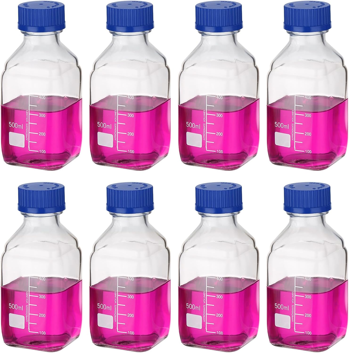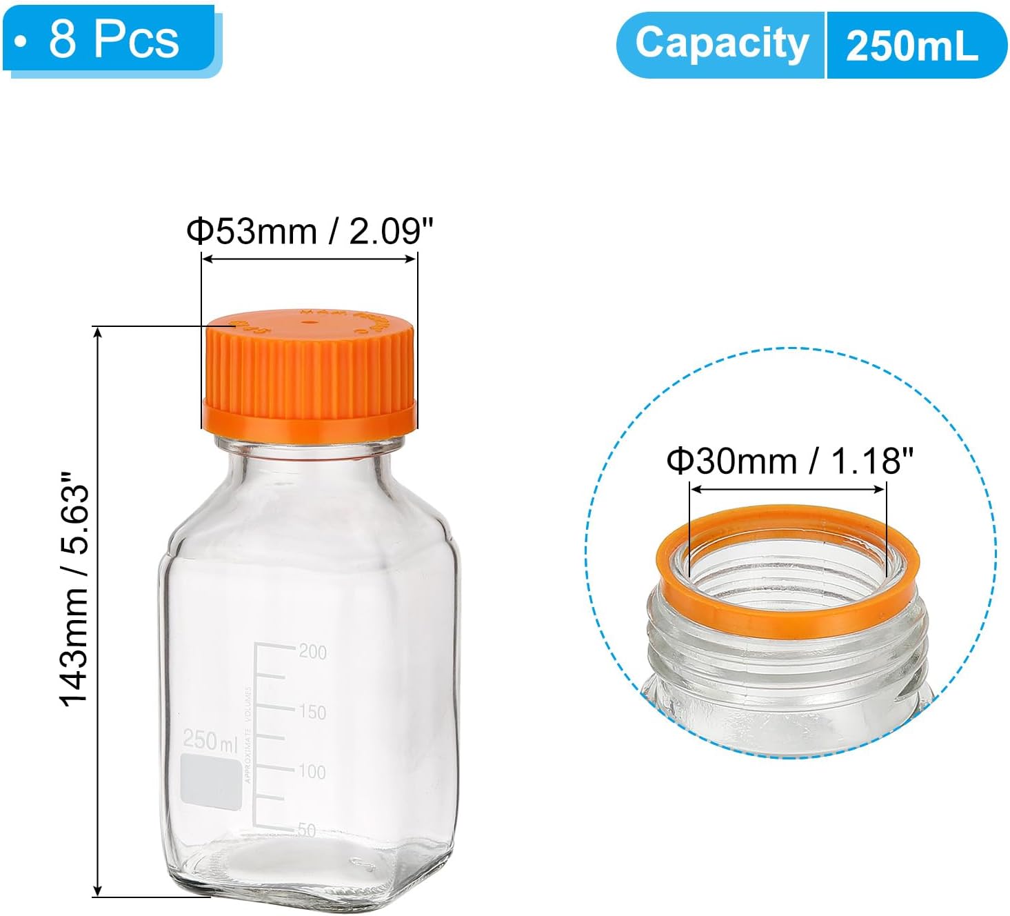 Leakproof: Our Media Storage Bottles are designed with a smooth bottle mouth that perfectly fits the GL32 screw cap, ensuring a tight and secure seal. This leakproof feature prevents any liquid from spilling or leaking out of the bottle, minimizing the risk of evaporation and exposure to external elements.Easy to Read: Package includes 8 pack Media Storage Bottles with a capacity of 250ml, featuring a graduated white printed scale, providing precise measurement and accurate volume readings. The smooth surface of the bottle allows for easy cleaning and ensures clear visibility during experiments or storage.Durable Material: Made from borosilicate glass, which is excellent durability and heat-resistance. They are chemically resistant and maintain their transparency even after repeated use. The thickened bottom adds to their durability and ensures long-lasting performance.Large Marking Area: These bottles are suitable for storing media, reagents, and other liquid solutions in laboratory, experimental, or home settings. The large marking area allows for easy identification and labeling of contents, facilitating efficient organization and retrieval.Screw Cap: The screw caps of our Media Storage Bottles are made from durable polypropylene (PP). They exhibit excellent resistance to high temperatures and corrosion, with a maximum temperature tolerance of 140 degrees Celsius. The secure screw cap design ensures airtight sealing and protection of stored liquids.