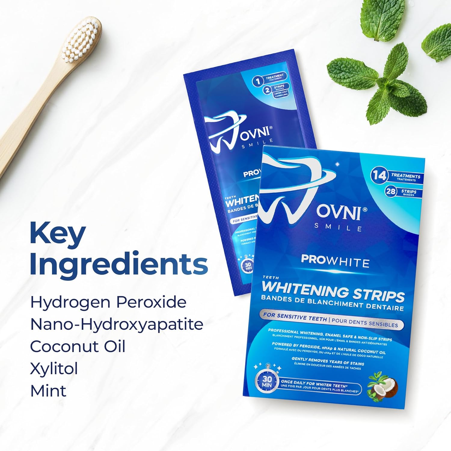Unlock a brighter, healthier smile with OVNI Smile PROWHITE Whitening Strips, expertly designed for sensitive teeth whitening. Our peroxide-powered formula targets tough stains from coffee, tea, and wine, while staying gentle on enamel. These fast teeth whitening strips are enriched with coconut oil and refreshing mint extract, creating a soothing experience that leaves your teeth and mouth feeling clean and fresh after every session. Unlike ordinary whitening products, PROWHITE uses triple-action technology to deliver visible results in just 30 minutes a day. The no-slip design ensures the strips stay firmly in place, letting you go about your routine with confidence. Pair your whitening journey with floss, floss sticks, dental floss picks, and your favorite tooth brush to maintain long-lasting results. Whether you want a whiter smile before an event or daily confidence, PROWHITE makes professional-level whitening convenient at home.