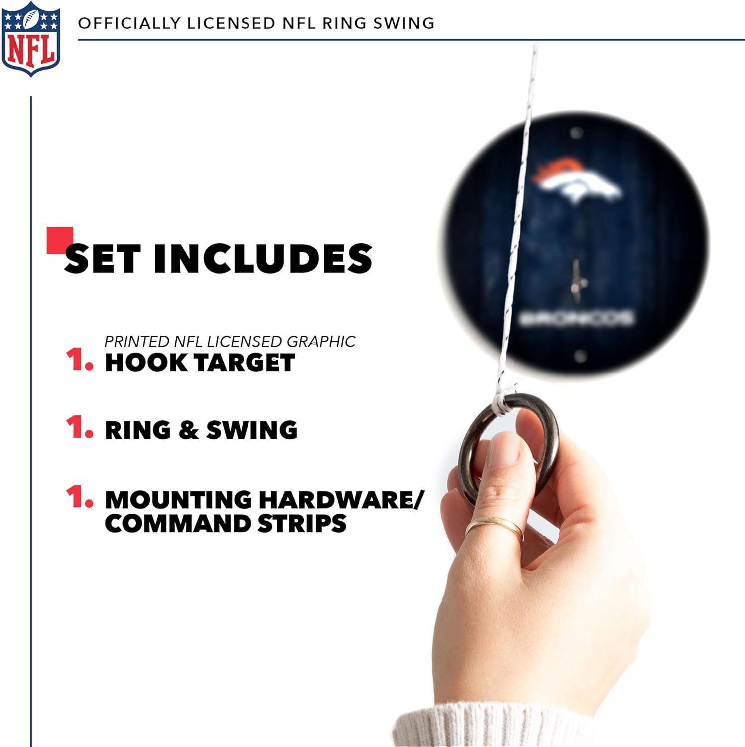 Officially Licensed NFL Ring Swing Game is the perfect combination of fun and challenge, making this hook and ring game highly addictive and entertaining for players of all skill levels. The game is easy to hang, so you can set it up quickly and start playing right away. Available in all 32 NFL teams, this game room game provides a unique and exciting way to show off your team spirit. The high-quality graphics and durable construction make this game perfect for both indoor and outdoor use. The ring swing game is challenging to play, making it a great option for both kids and adults. You need just the right touch to swing the ring and land it on the hook. It's designed to test your hand-eye coordination, reflexes, and patience, making it a fun and entertaining way to improve your skills. It's easy to hang and comes with everything you need to play, so you can take it with you wherever you go. Great for your game room, man cave, rec room, basement, or garage! The officially licensed NFL ring swing game is a perfect gift for any sports fan or for anyone looking for a fun and challenging new game. It's easy to learn, but difficult to master, making it a great choice for families, friends, and anyone looking for a new indoor or outdoor activity. So why wait? Get your own officially licensed NFL ring swing game today and enjoy hours of fun and entertainment!