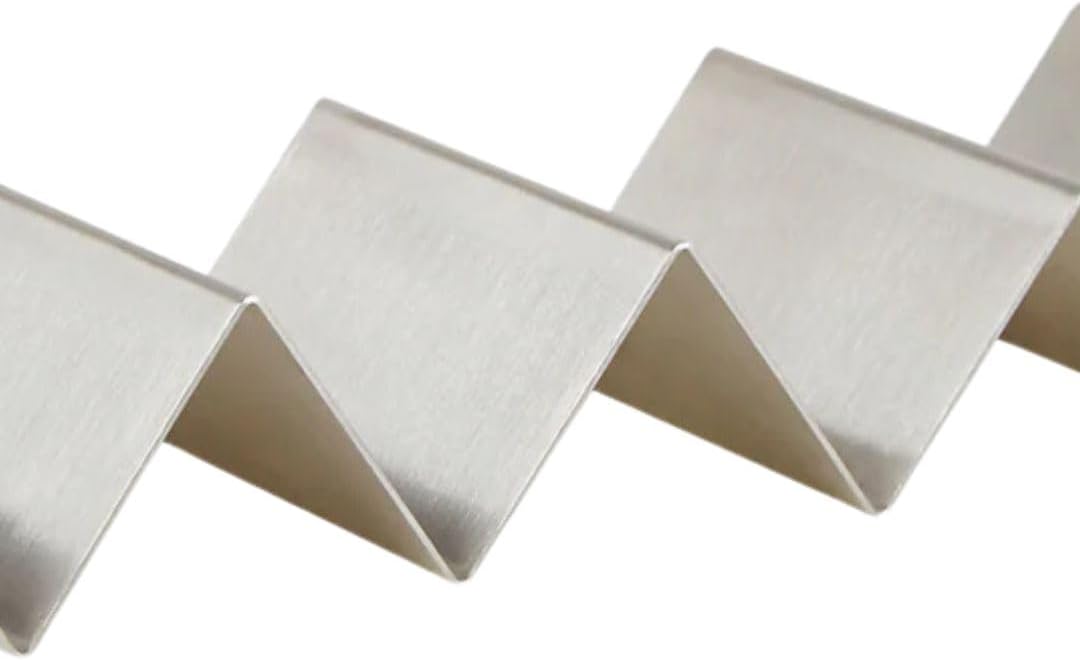 The Soro Essentials- Set of 2 Stainless Steel Taco Holder 3-4 Slots is the perfect solution for serving, assembling, and enjoying tacos without the mess. Designed to hold either 4 or 5 tacos each—depending on which side is facing up—these versatile taco racks keep your soft or hard taco shells upright and perfectly presented every time. Whether you're serving street tacos or full-size tortillas, these holders add style and function to your taco nights, parties, or casual dinners. Crafted from durable, food-grade stainless steel, each taco tray features a brushed finish for a sleek, modern look that complements any kitchen or dining setup. The sturdy construction ensures stability while filling and serving, preventing your tacos from tipping over or spilling their delicious contents. Ideal for prepping tacos in advance or carrying them from the kitchen to the table, these racks make taco assembly cleaner and more efficient. Each holder accommodates 3 tacos when placed one way and flips to hold 4 when turned over—offering flexibility based on your portion size or number of guests. The smooth, easy-to-clean surface is dishwasher safe, making post-meal cleanup quick and hassle-free. Compact and stackable, these trays store easily when not in use. Perfect for taco Tuesdays, fiestas, BBQs, or restaurant-style presentations at home, the Soro Essentials Taco Holder Set adds convenience, cleanliness, and a polished look to your taco-serving experience. Keep your tacos upright, your toppings intact, and your presentation on point with these must-have kitchen accessories. Measures 11" x 4" x 2.0" Set of 2 Stainless Steel Taco Holder 3-4 Slots.
