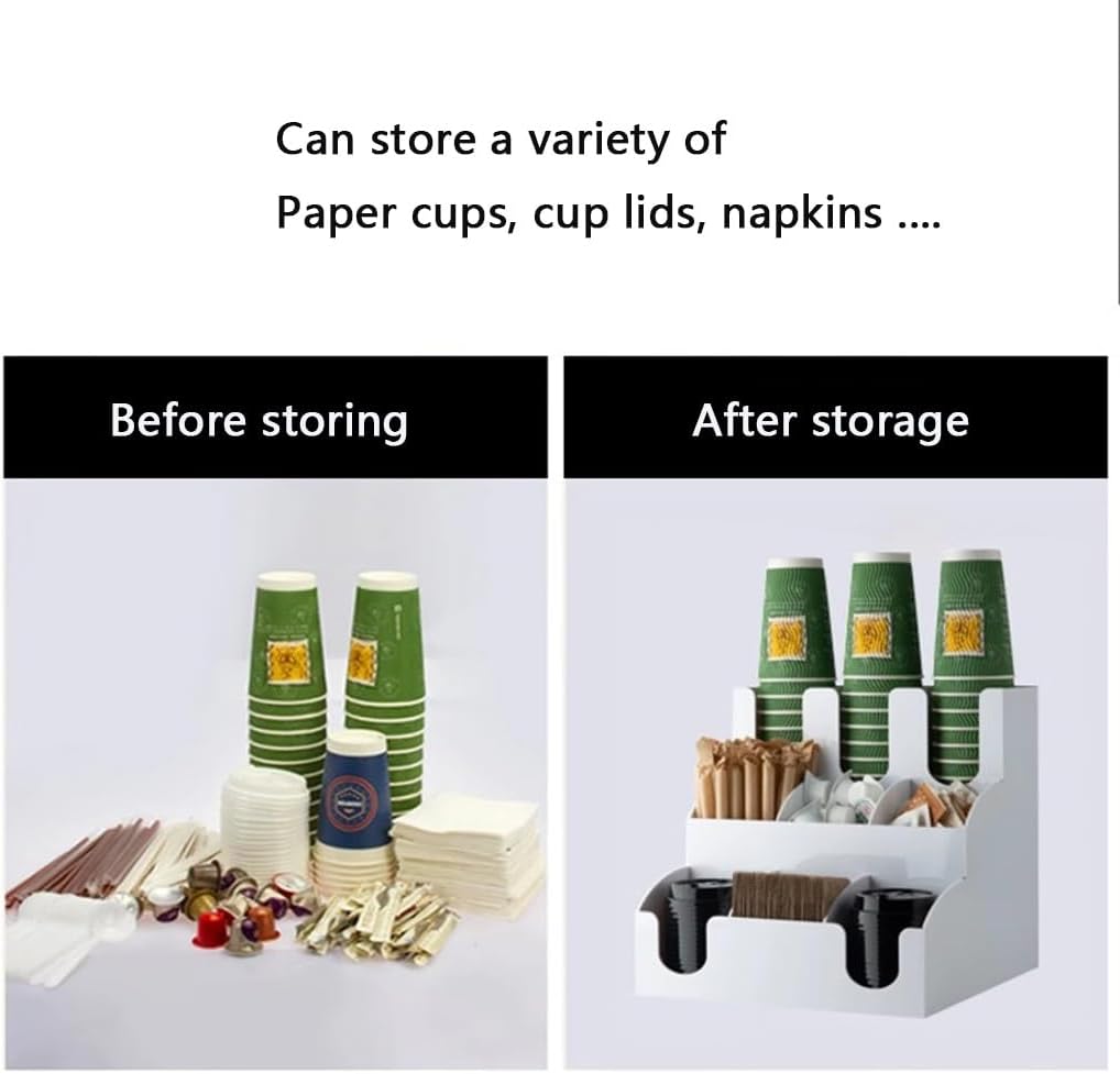 This coffee condiment organizer is the perfect solution for keeping your beverage stations and break rooms well-organized. With ample storage space, it is an essential addition to any kitchen or office environment, designed to meet all your organizational needs at home or in the workplace. **Product Features:** 1. **Efficient Design**: The tilted vertical design accommodates cups and lids with a diameter of less than 10cm (3.9 inches), making it easy to access your essentials. 2. **Stainless Steel Construction**: Crafted from durable stainless steel, this tiered compartment organizer allows for easy reach and functionality. It features 9 compartments to neatly store paper cups, lids, straws, stirrers, creamers, sweetener packets, and more. 3. **Versatile Use**: This organizer is perfect for various settings, including offices, waiting rooms, and reception areas, ensuring that everything you need is within easy reach. **Product Details:** - **Product Name**: Disposable Cup Holder - **Material**: Stainless Steel - **Dimensions**: 30.5 x 30.5 x 29 cm (12 x 12 x 11.4 inches) - **Suitable for**: Everyone - **Ideal For**: Home decoration, kitchen, cabinet, pantry, cafe, bar, and more. - **Features**: Safe, practical, sturdy, and durable. - **Shipping List**: Coffee cup holder (only the holder, other items are props). Please note that we only sell the holder, excluding decorative items. Due to different measurement methods, there may be a slight variation of 1-2cm. Additionally, color differences may occur due to lighting and monitor settings. Enhance your space with this stylish and functional coffee condiment organizer, perfect for any setting where convenience and organization are a priority.