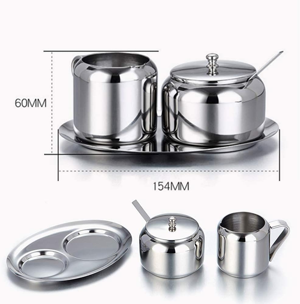 Milk and sugar set made of stainless steel, 3-partFor a beautifully laid tableIt consists of a milk jug and a sugar bowl in an elegant stainless steel chrome design.In addition to its functionality, it also convinces on the outside.Thanks to their simple construction and their distinctive shape, the milk jug and sugar bowl can be combined well with other dishes.These two accessories are the ultimate eye- on every coffee table. Try it!Box contain:- 1 milk can - 1 sugar bowl - 1 sugar spoon - 1 drawer