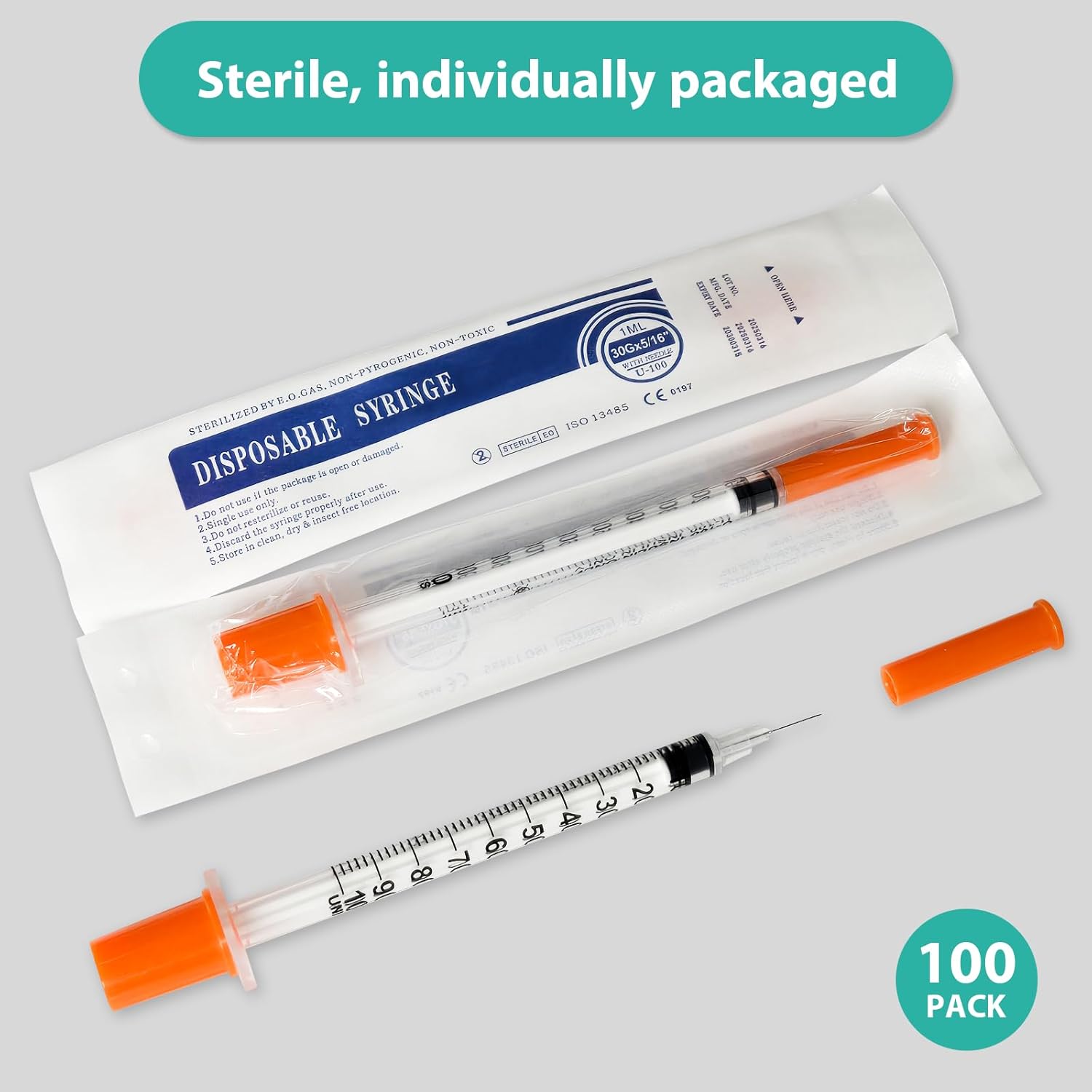 Product: Disposable Sterile Syringe with NeedleCapacity: 1ml/ccSize/Model: 30G, 5/16" (8mm)Quantity: Pack of 100Product Features:Safe & Individually Sealed: Each syringe is individually sealed to ensure sterility and safety.Leak-Proof Design: Securely engineered to prevent leaks during use.Smooth Plunger Action: Easy to push and pull without sticking.Clear Graduations: Bold, easy-to-read markings for accurate measurement.Versatile Use: Ideal for laboratory, industrial, or household projects.Important Note:Not for professional medical use.