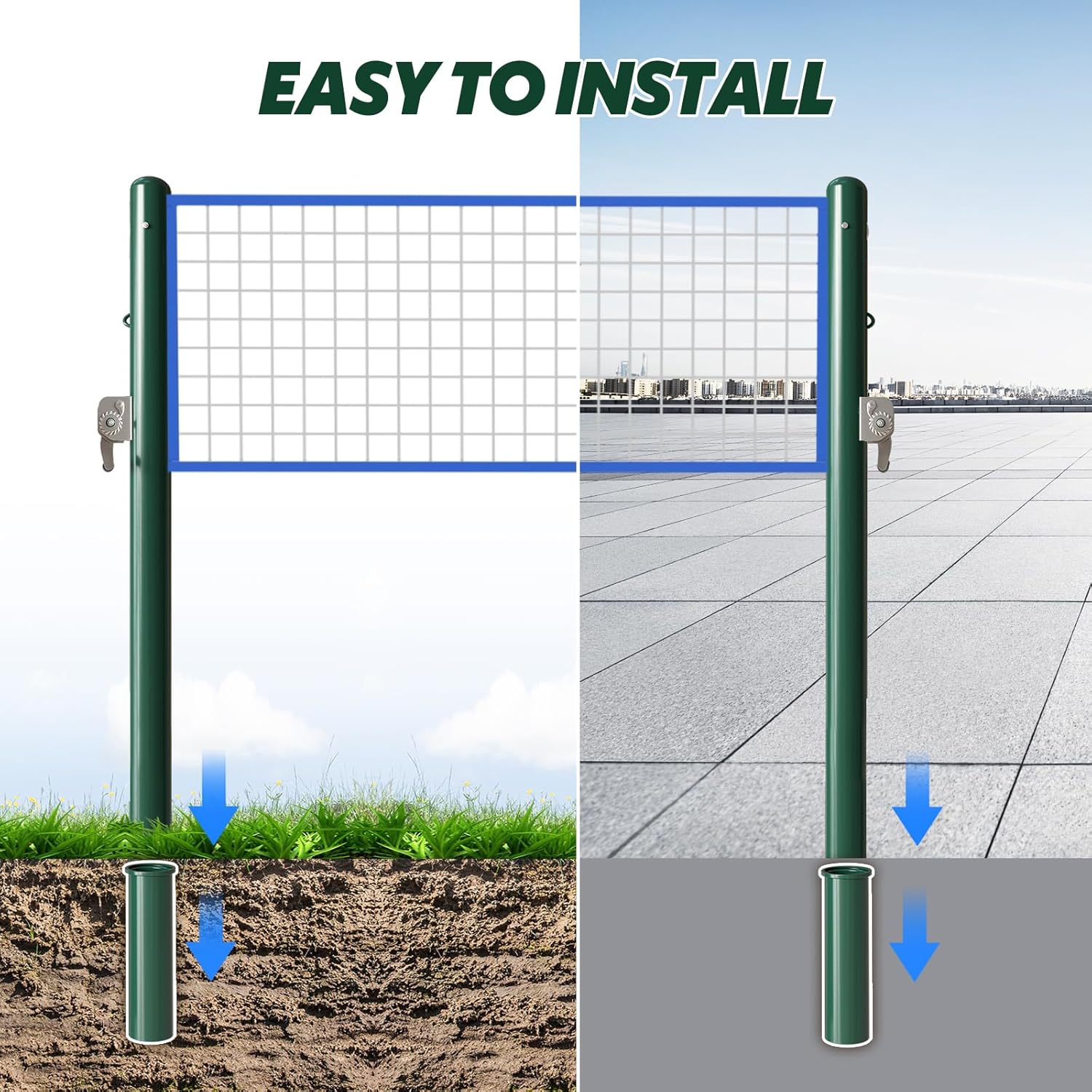 --These posts feature reels mounted on both posts. This makes it easier to adjust the net tension. -- These posts are made from thickened metal tubing. The 3" diameter tubes are durable and retain their shape. --These posts can be installed on grass, flat, or sloped ground. Suitable for schools, parks, gyms, driveways, backyards, and more. Product Type: Tennis Posts Color: Green/Yellow Material: Iron Ground Height: 42.13" Weight: 35 lbs Number of Reels: 2 Net not included