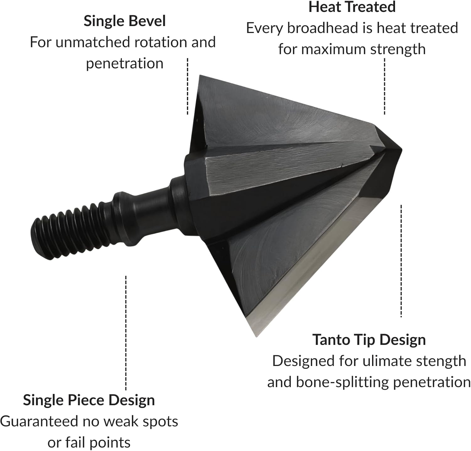 100 grains of unyielding, American-crafted precision. When stealthy flight meets raw power, meet the 100-Grain 1-Inch Single Bevel Broadhead. Crafted from a single piece of high-carbon steel, this fixed 2-blade powerhouse has no moving parts, no weak points, and no apologies. Thickest blades we've ever made 0.060 inches of single bevel delight. Tanto tip because bone is meant to be shattered. Single bevel rotation on impact deeper penetration, nastier wound channels. Razor-sharp out of the box, easy to sharpen on any flat stone.