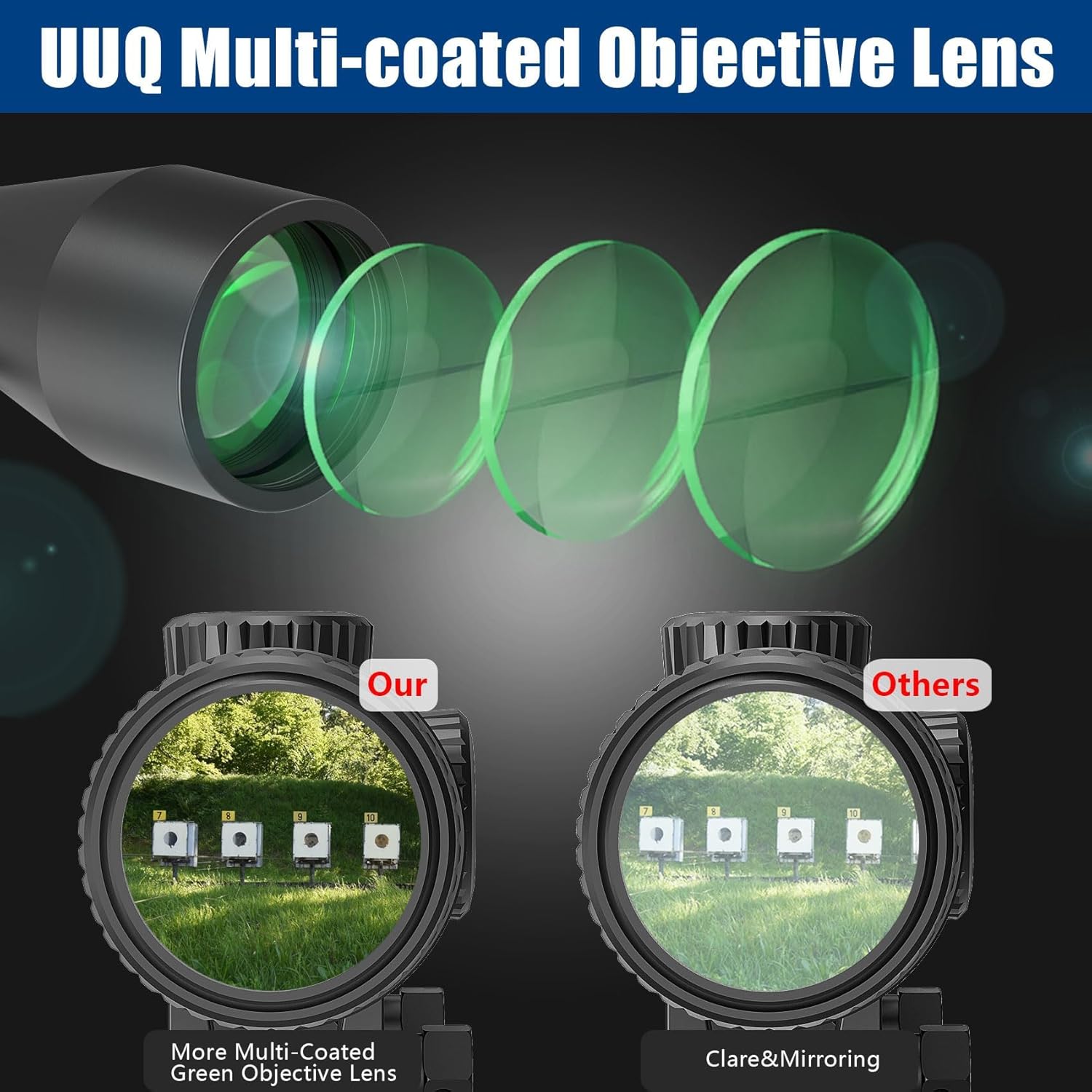 UUQ VibeShield Rifle Scope with Mil-dot Reticle - Shockproof SFP Optics for Hunting and Airsoft, Fit Large Caliber & High Recoil Guns, FMC Green Lens, 1-Inch Tube, Includes 20mm Mounts