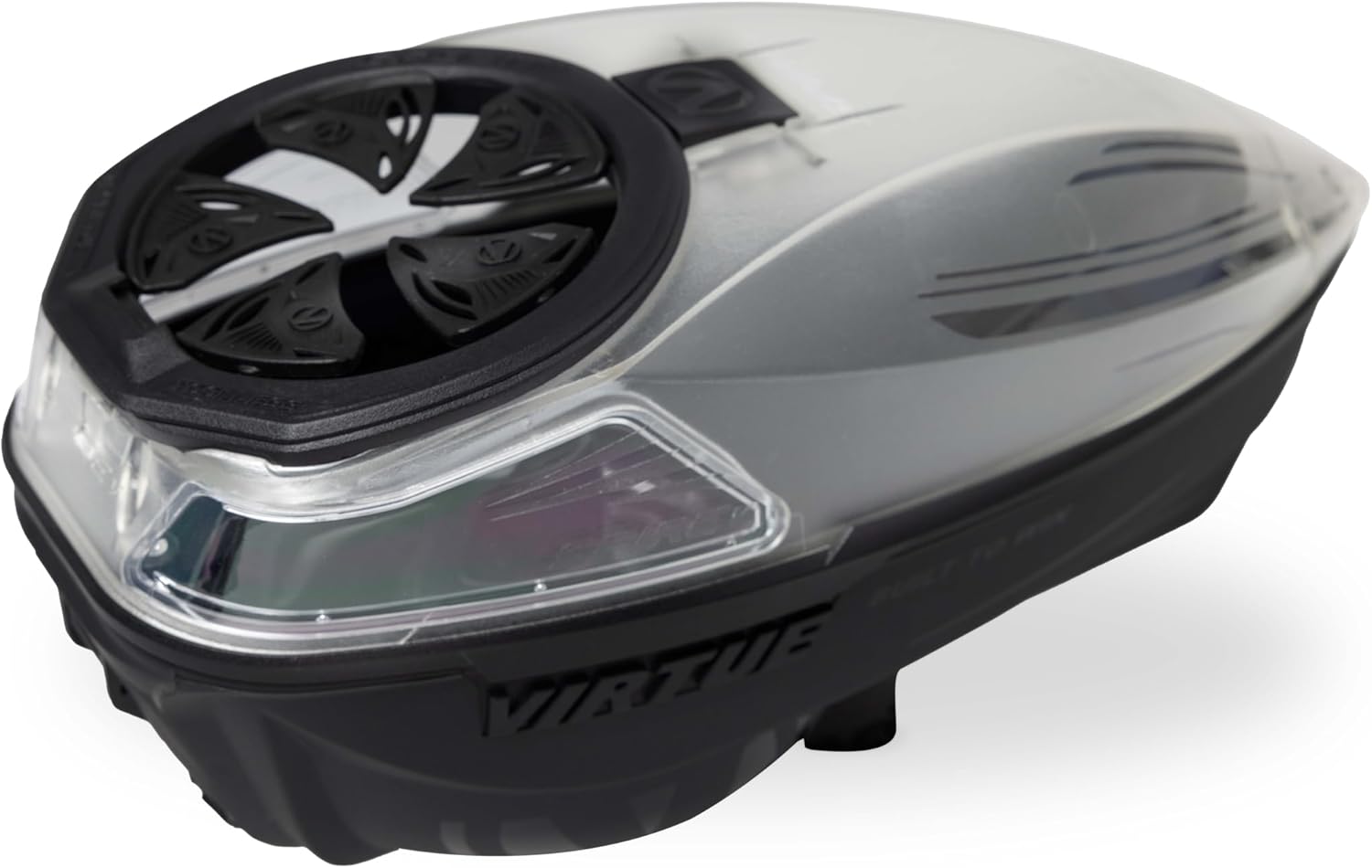 Take your game to the next level with the Virtue Spire V — a high-performance paintball loader engineered for speed, reliability, and ease of use. The latest evolution in the Spire series, the Spire V introduces dual sensor technology, combining accelerometer and infrared activation for even more consistent, jam-free feeding shot after shot. Compared to previous models, the Spire V features a completely redesigned drive system for improved performance and durability, along with stronger proactive feeding logic for faster response during rapid fire. A new, improved tray geometry makes maintenance easier and reduces paint breakage even further. It also comes equipped with a hinged shell design, allowing for quicker, truly toolless access. The rugged glass-filled nylon shell is ultra-lightweight yet built to withstand the rigors of tournament play. Flexible rubber fingers gently feed paintballs of all shapes and sizes, including brittle or imperfect paint, with zero jamming. The Spire V holds up to 230 paintballs and includes the CrownSF III speed feed with removable spring fingers for lightning-fast reloads. A matching rain lid is also included to keep your paint dry when the weather turns. Whether you're competing at the highest level or stepping up your rec play, the Spire V delivers elite performance, smarter feeding, and faster maintenance — a major upgrade over its predecessors. Limited Edition with crystal top shell