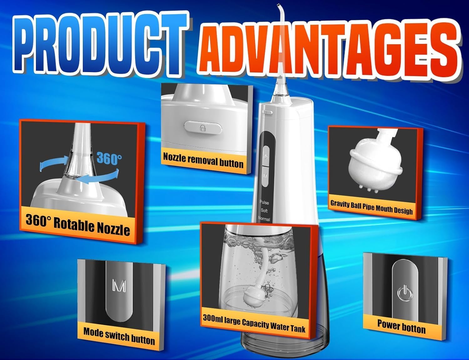 The Professional Cordless Water Flosser is your personal oral health expert on-the-go, helping you powerfully clean 99.99% of food debris and plaque, a secret weapon for maintaining a healthy, beautiful smile. The flosser is made of the latest water pump with ultra-quiet design, noise ≤ 55db, you can use it in the early morning and late night without disturbing others. The IPX7 rated waterproof and portable design makes it easy to put it in your bag or suitcase when you are traveling, shopping, dining or at home. The cordless flosser features a newly upgraded leak-proof drain cover and removable water tank to eliminate your worries and deliver a cleaner, more comfortable oral care experience. Extremely easy to use! Simply fill the reservoir with water, install the nozzle into the nozzle insertion hole, and select the intensity and it will start flossing in one second (we recommend starting with the lowest pressure). STEPS for USAGE 1.Attach a nozzle onto the unit; 2.Open the reservoir door to fill with water; 3.Select soft or pulse mode at first; 4.Lean low over sink and place the tip into your mouth; 5.Aim the tip towards the teeth at roughly 90 degrees, and turn it on; 6.Glide tip along your gumline, cleaning from back teeth to front teeth; 7.Hold the unit in an upright position and keep your mouth slightly opened to allow the water flow out; 8.Empty the reservoir and wipe it dry. Warm Tip *The low mode is better for the beginner. *If your teeth is sensitive, lukewarm water would be better. *Do not take the water flosser out of your mouth while it is working. Package list 1* Power dental flosser 4* Replacement Jet Tips 1* USB charging cable 1* User manual