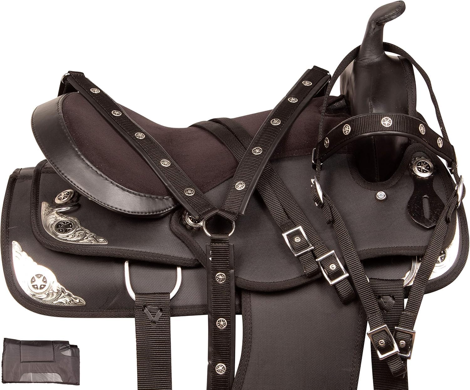 Upgrade your riding experience with our Premium Cordura Synthetic Western Saddle, built for riders who value durability, comfort, and style. Its lightweight construction reduces strain on your horse while offering easy handling for you. The deep padded seat and ergonomic design keep you balanced and supported whether you're trail riding, barrel racing, or training. Each saddle includes a complete tack set—breast collar, headstall, and reins—so you’re ready to ride as soon as it arrives. Designed for riders of all levels, this saddle is easy to maintain; simply wipe clean to keep it looking fresh. No Surprise Costs: All U.S. duties and taxes are fully prepaid—what you see is what you pay. Please note: duties and taxes are non-refundable in case of returns or replacements.