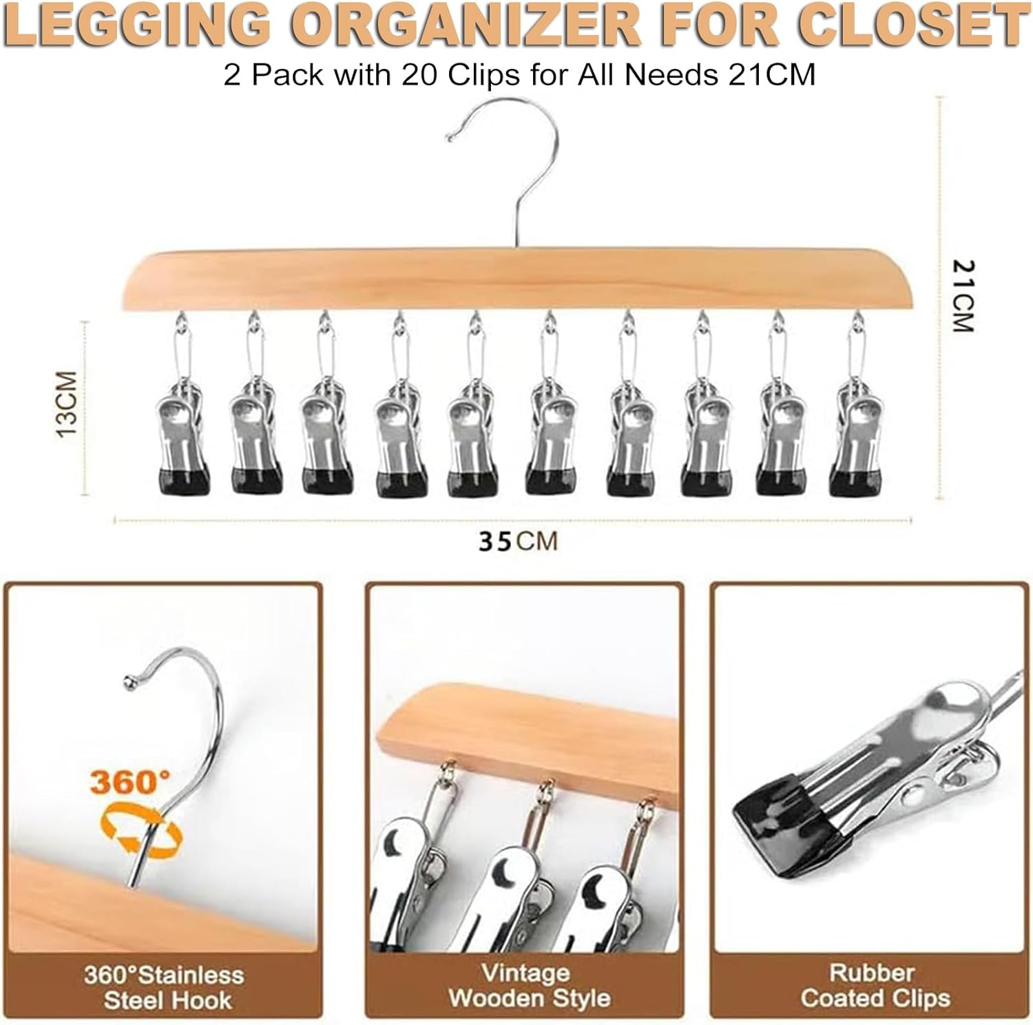 2-pack wooden closet hangers with 10 clips each, designed for vertical space-saving storage of pants, scarves, hats and accessories. Stable, easy to use and suitable for most closets. Core Advantages Vertical design saves valuable closet space effectively. Stable clips hold garments gently without creases or damage. Multi-purpose for clothing, accessories and daily items. Sturdy structure and 360° rotating hook for long-lasting use. Balanced hanging design for stable and tidy storage. How to Use Hang the organizer on a closet rod or suitable hook. Clip your pants, scarves, hats, socks or other items evenly. Adjust items as needed to keep balanced and neat. Use the rotating hook for easy access from any angle. Product Parameters Item: Closet Organizer Hanger with Clips Material: Wood + Metal Clips: 10 clips per piece Quantity: 2 PCS Function: Space-saving hanging storage Application: Pants, scarves, hats, socks, skirts, towels, accessories Feature: 360° rotating hook, balanced hanging design
