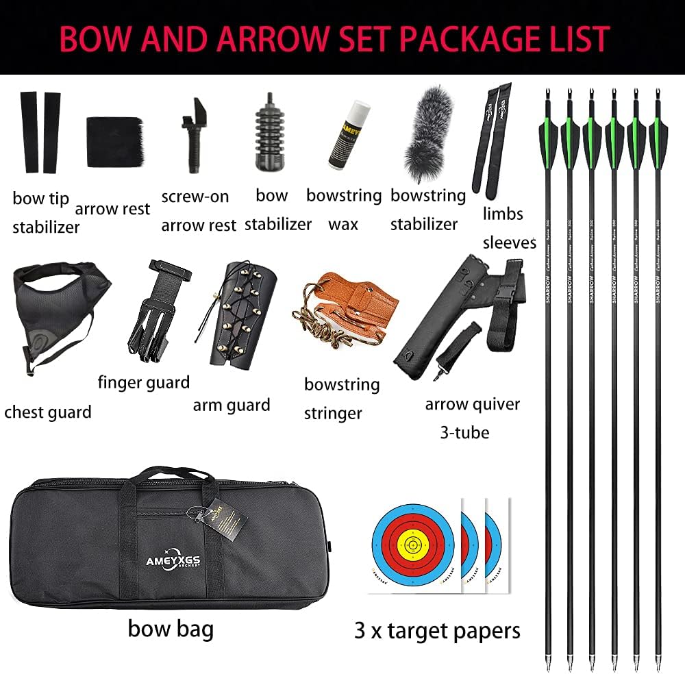 Technical specifications: Color: black Bow Length: 62"/157.5cm Draw Weight options 30-60lbs(5lbs increments) Maximum Draw Length: 32"/81.28cm Bowstring Length: 59"/149.86cm Brace Height: 18-20cm(7.08-7.87 inches) Net Weight: 3.8lbs/1.72kg Bow Riser: metal Bow limbs: Imported USA Gordon sheets Bow and Arrow Set includes: 1 x Recurve Bow 3 x Copper weight(installed on the bow riser) 1 x bow string stabilizer 1 x bow limbs stabilizer 1 x bow stabilizer 1 x leather arrow rest 1 x screw on arrow rest 1 x bow stringer 1 x arm guard 1 x finger guard 1 x chest guard 1 x bowstring wax 1 x bow bag 1 x arrow quiver 1 x a pair of bow limb sleeve 3 x target papers 6 x carbon arrows 4 x wrenches FEATURES: BOW Riser: 19" metal ILF bow handle, CNC Machining, exquisite, with beautiful line and round edges, particularly wooden design for the bow grip, providing a sleeker, lighter weight, and more comfortable experience for you. BOW limbs & bowstring: Imported USA Gordon sheets, resistant to bending, ensure the good performance, shooting smoothly. Bow string adopts BCY-D97 professional material which from the USA, black and gray two-color mixed, wear-resistant and tensile. FEATURES: ILF POCKET FITTING- Easily to put together or takedown the riser and limbs. You will always be able to change the limbs to increase the weight or decrease the weight. PARAMETER: Bow Length: 62"; Draw Weight options 30-60lbs(5lbs increments); Maximum Draw Length: 32"; Bowstring Length: 59"; Brace Height: 18-20cm. Net Weight: 3.8lbs